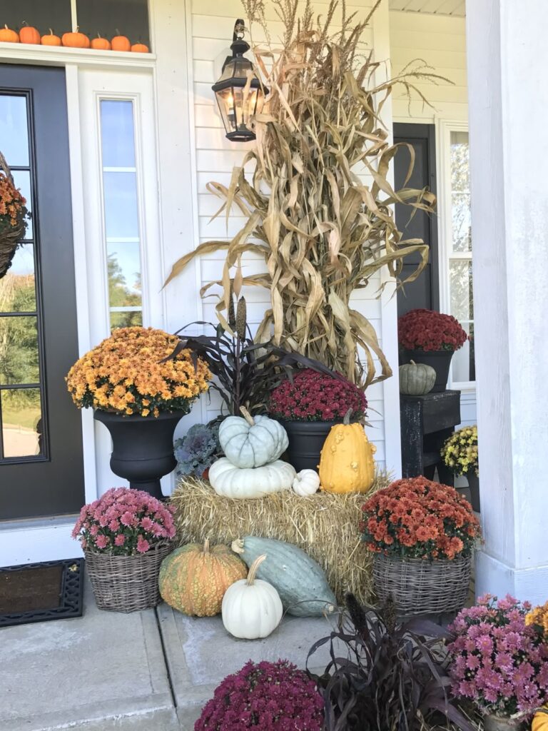 Mums are the obvious fall flower choice, but don’t leave them in the plastic pots they come in. Put them in woven baskets, terra cotta pots, or galvanized metal planters. It instantly makes everything look way more pulled together.