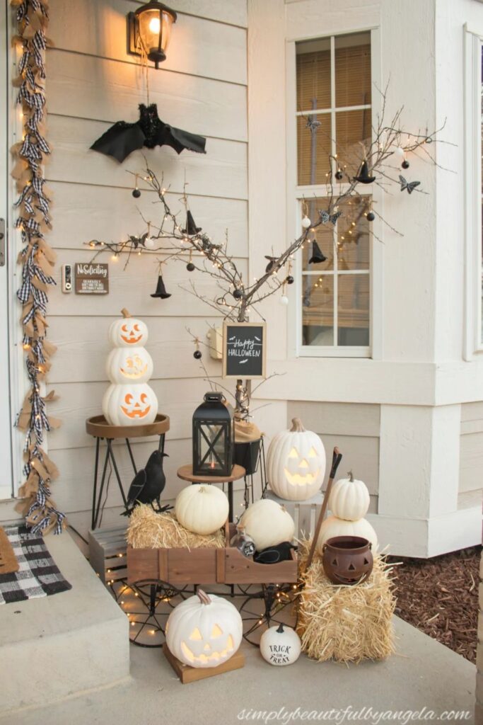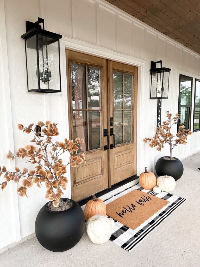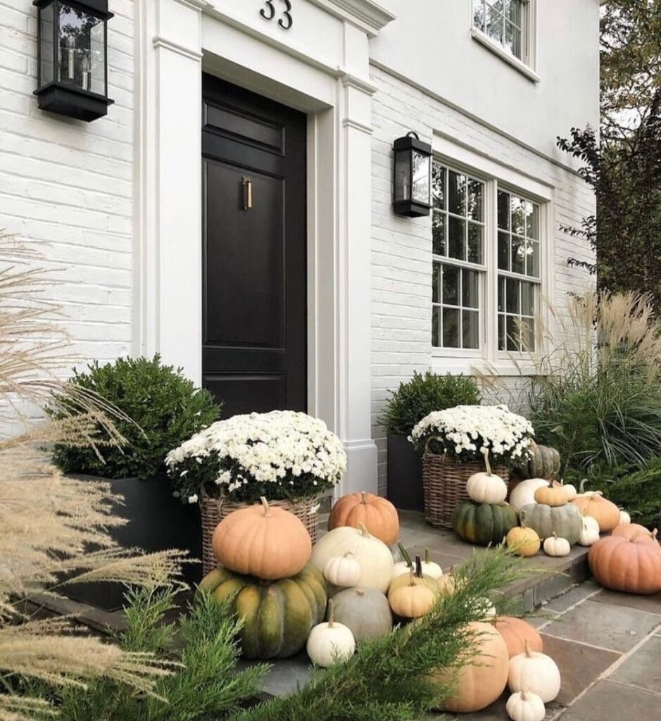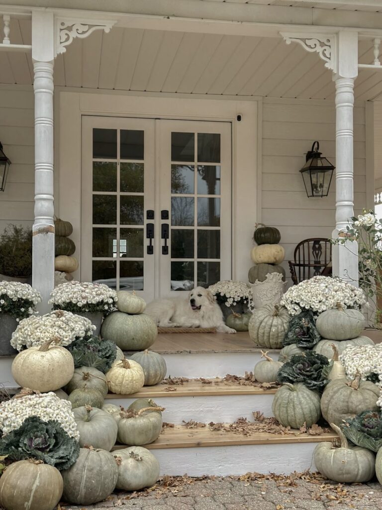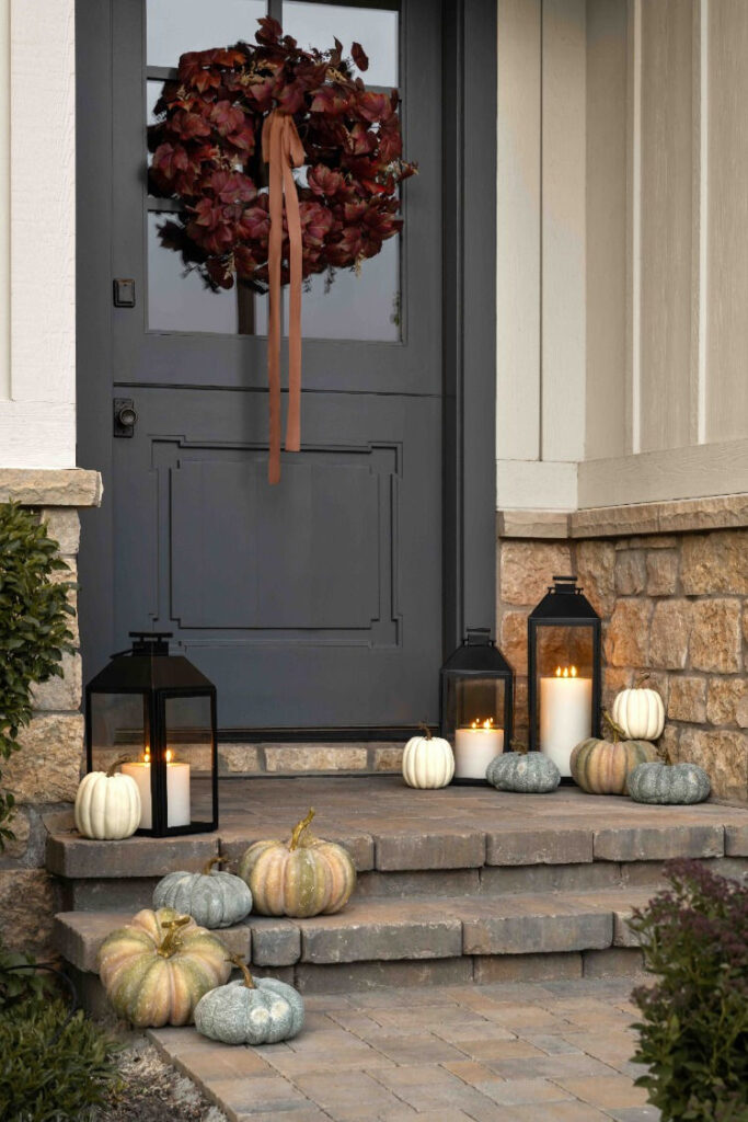 The more pumpkins, the better. I like mixing real and faux pumpkins so it looks full but doesn’t rot in a week. Stack them, mix sizes, use different colors (white, green, and orange are such a good combo).