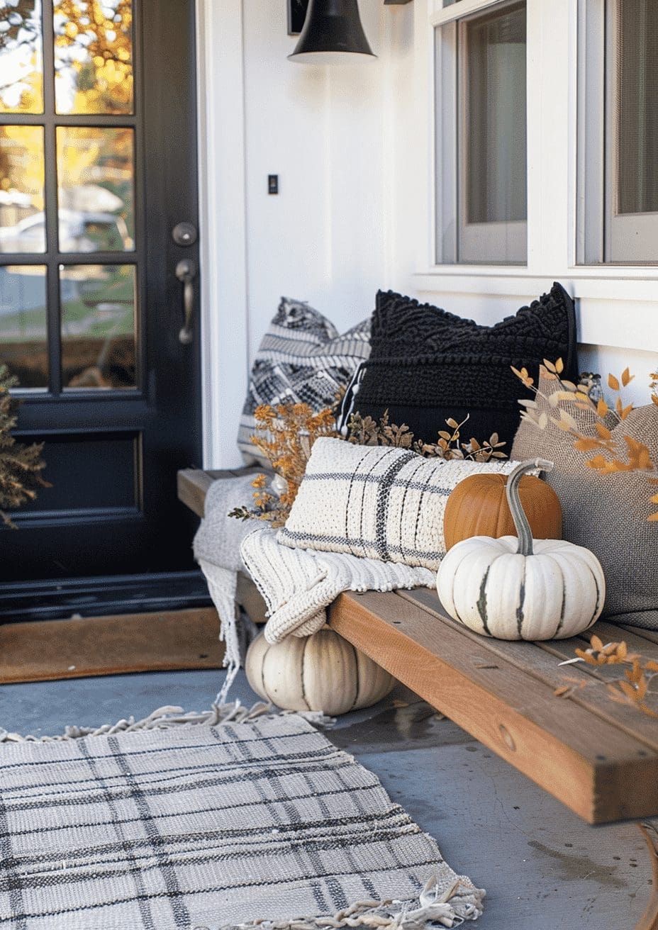 If your porch has a bench or chair, don’t skip this. A cozy plaid blanket and a cute fall pillow instantly make your porch feel more styled..and like the perfect place to sit with your coffee.