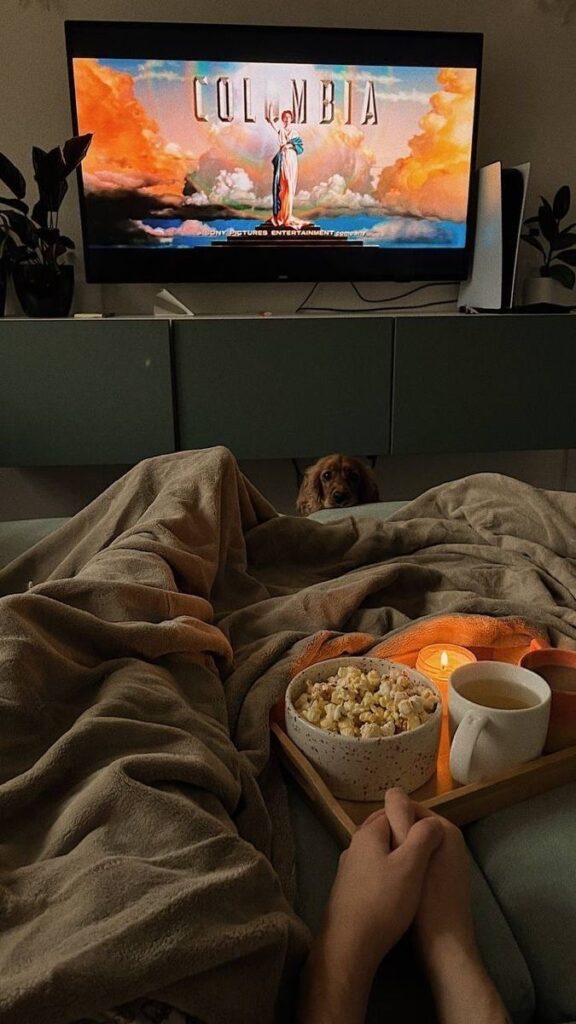 Choose a theme. Rom-coms, throwback movies, or a comfort favorite and build snacks around it. Popcorn, candy, cozy socks… all the things. The key is making it feel planned, not like you just collapsed on the couch.