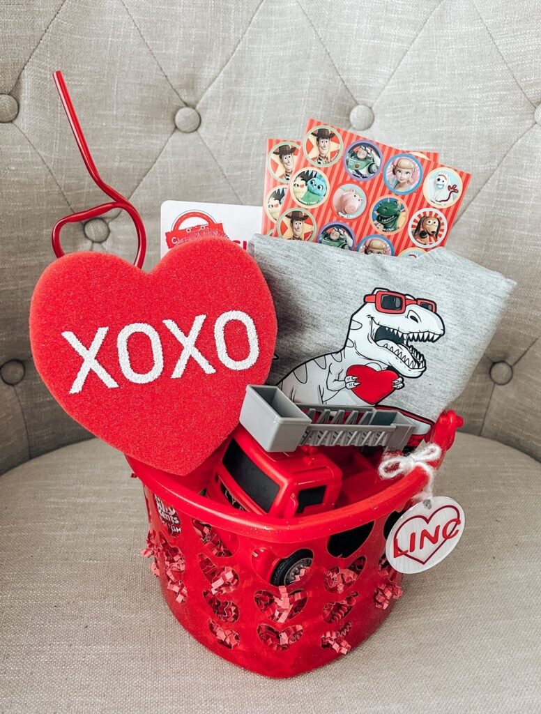 A fun mix of cozy, playful, and totally kid-approved. This red-themed basket combines dinosaur pajamas, a red toy truck, and Toy Story stickers for a playful Valentine’s Surprise. It’s perfect for kids who love dinosaurs and characters, and it feels fun without being overly themed.