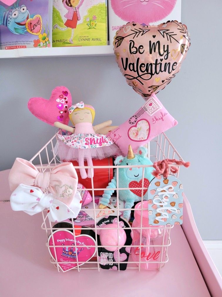 Heart-themed toys, love bug plushies, red and pink treats, and cute little accessories make this basket feel festive and fun without going overboard.