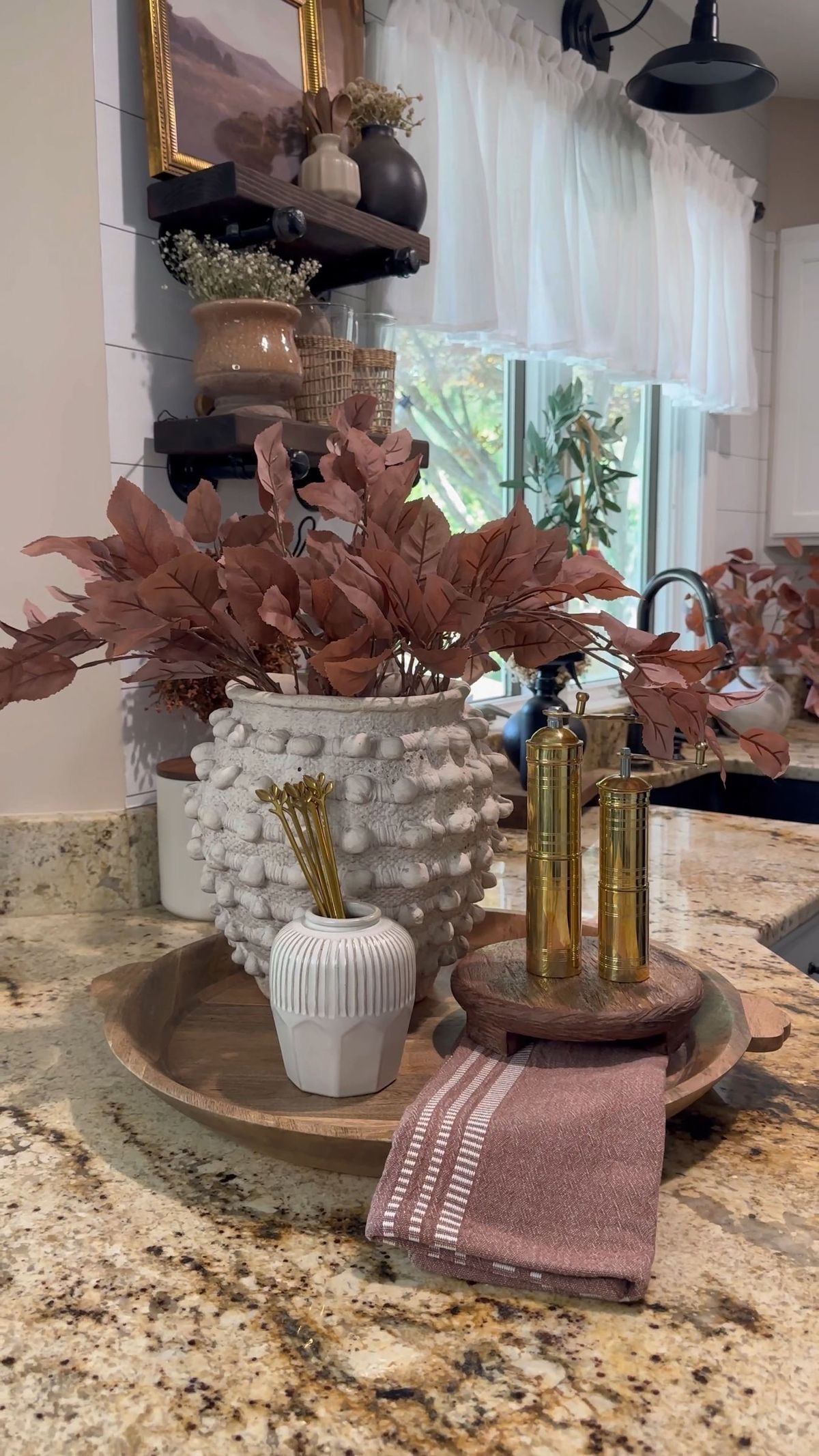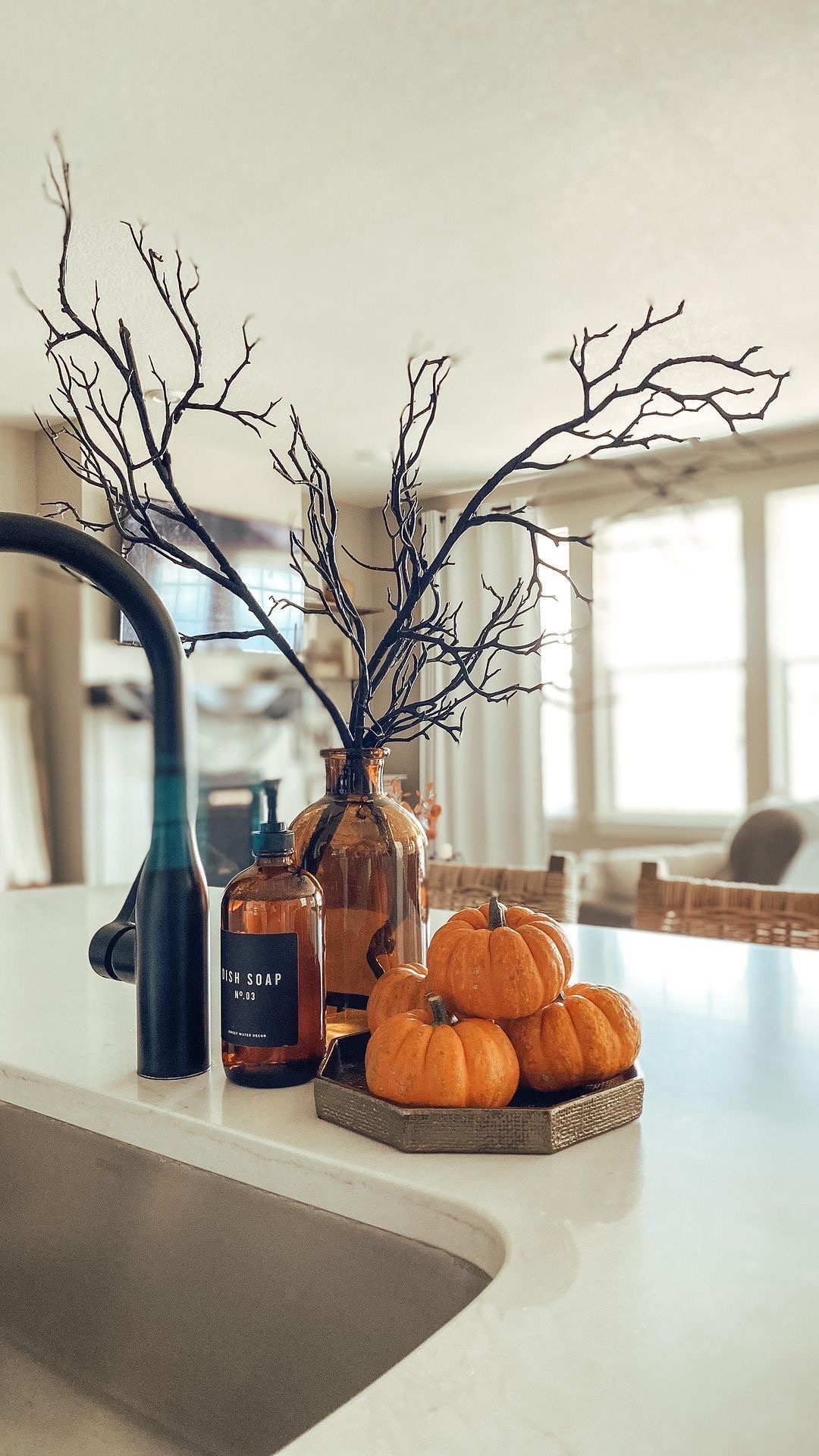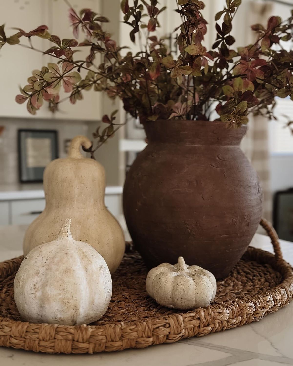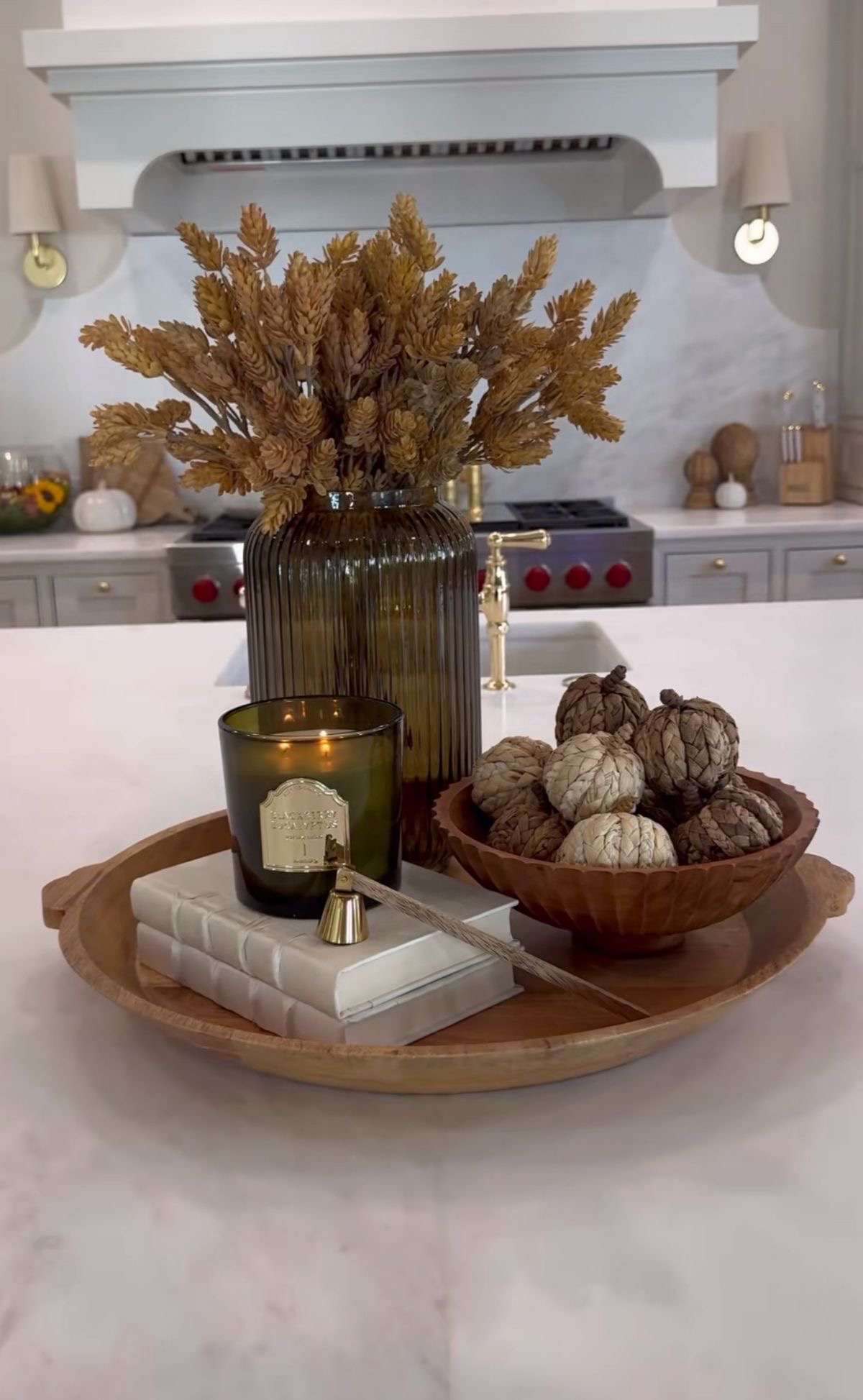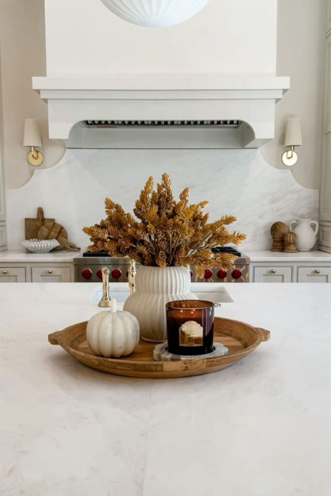 Gold instantly makes a tray feel fancy, but paired with warm fall details, it’s still inviting. Use metallics as a base when you want your kitchen to feel polished but seasonal.