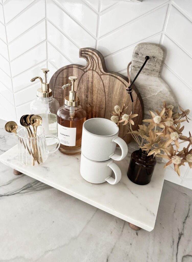 Your coffee area deserves a little seasonal love too. Layer in function pieces (like mugs and syrups) with a subtle fall accent to make your morning routine way more fun.