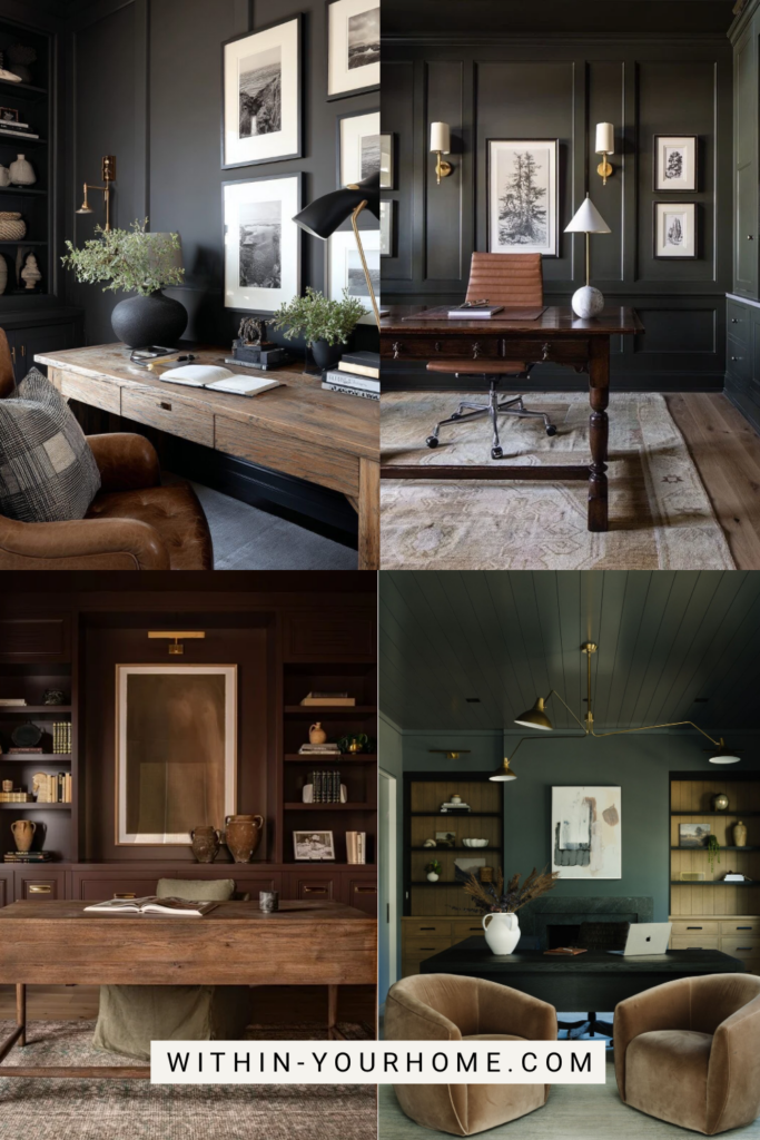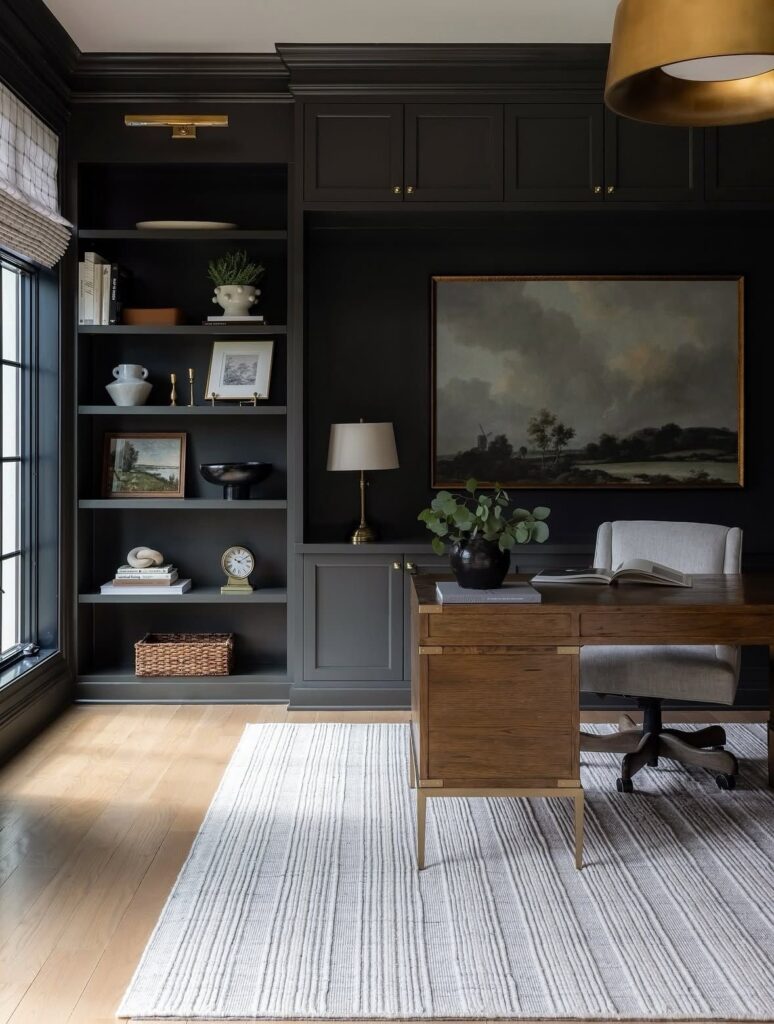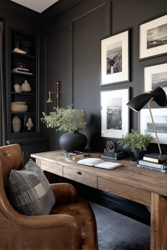 Transform your workspace with these moody home office decor ideas! Deep tones, cozy lighting, and modern accents that make your office feel stylish and productive.