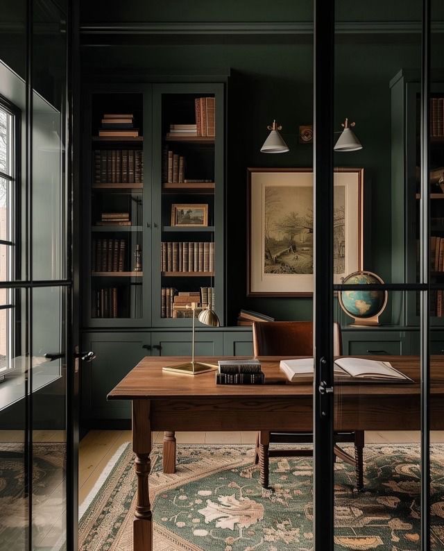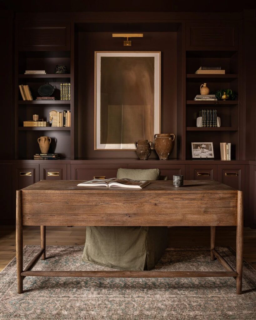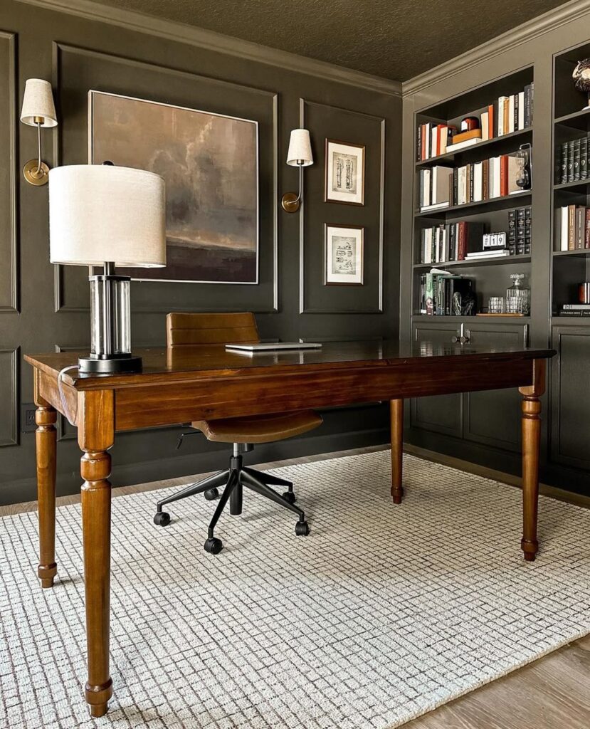 If you want a classic moody office look, a dark wood desk is it. It gives the room that “I get things done here” energy.