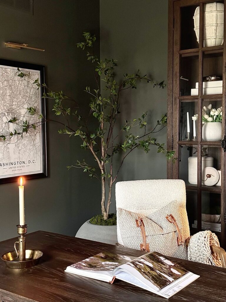 A big plant keeps the room from feeling too dark. Olive trees and rubber plants look the best in moody spaces.