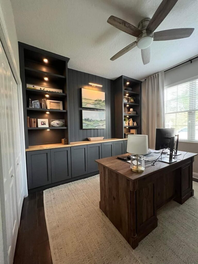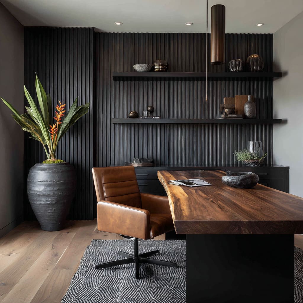 Fluted cabinets or desk add texture without ruining the moody look. They’re modern but still warm.