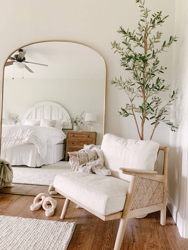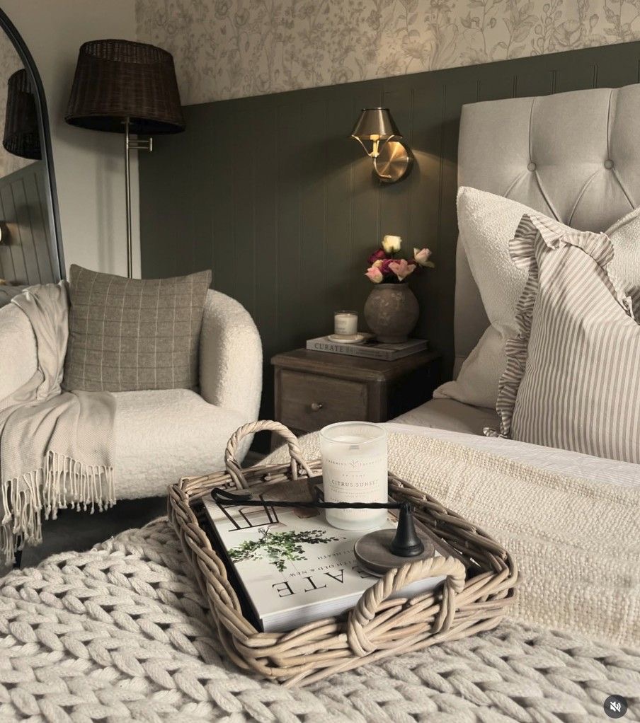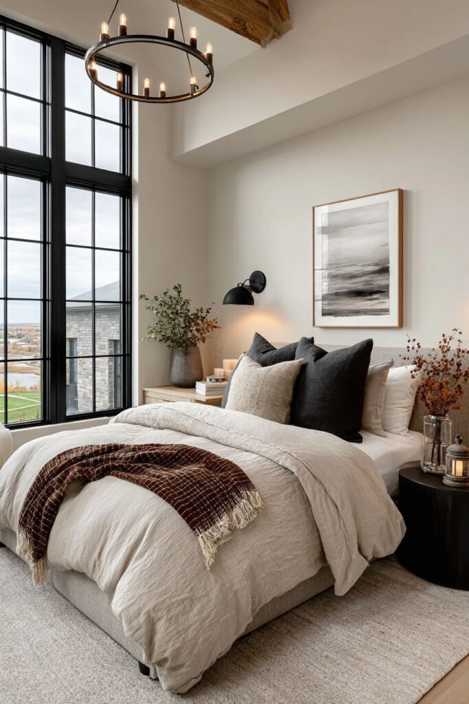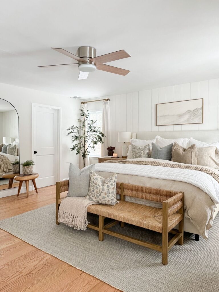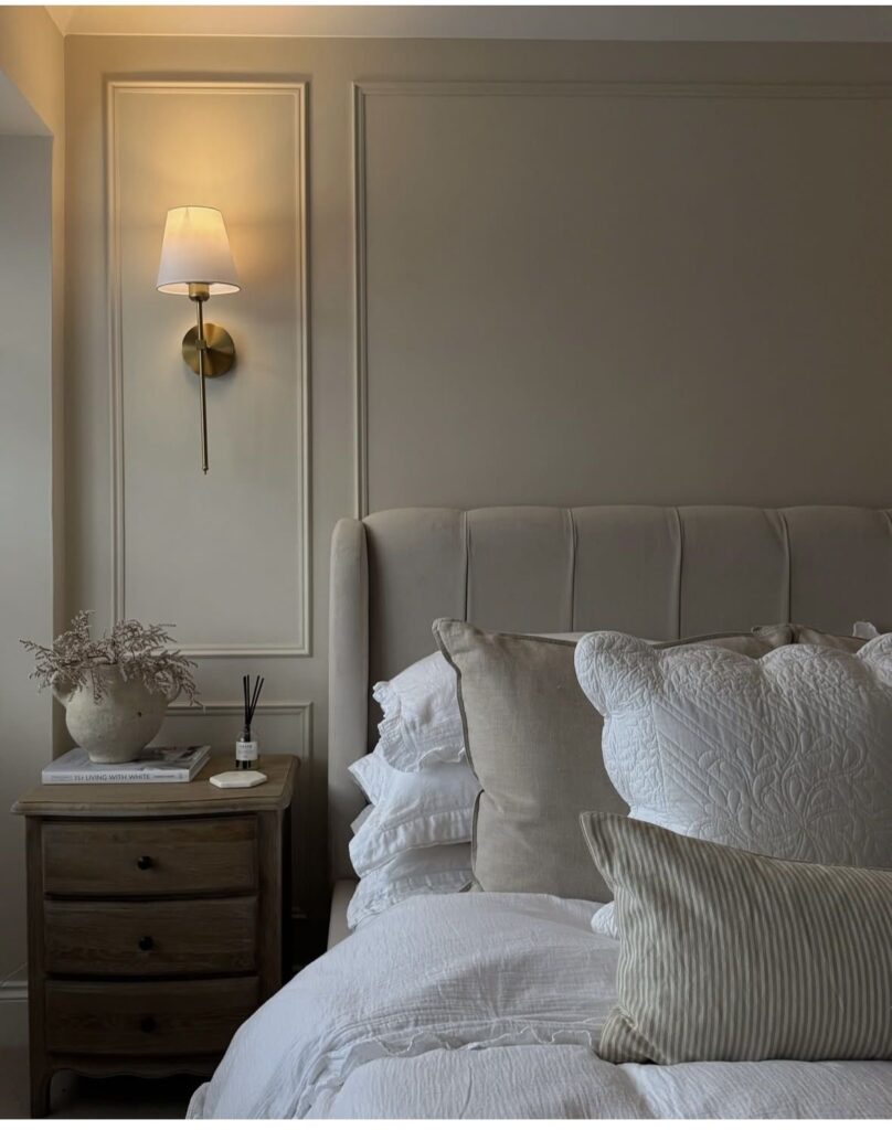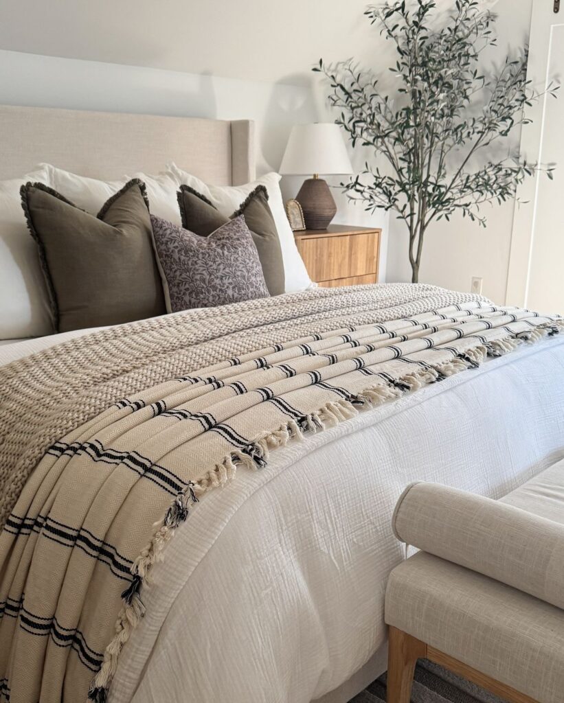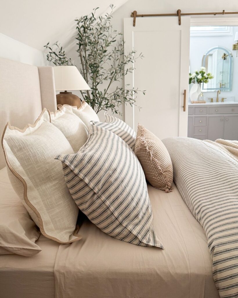 Soft whites, beiges, and cozy textures. When the bedding looks clean and inviting, everything else falls into place.