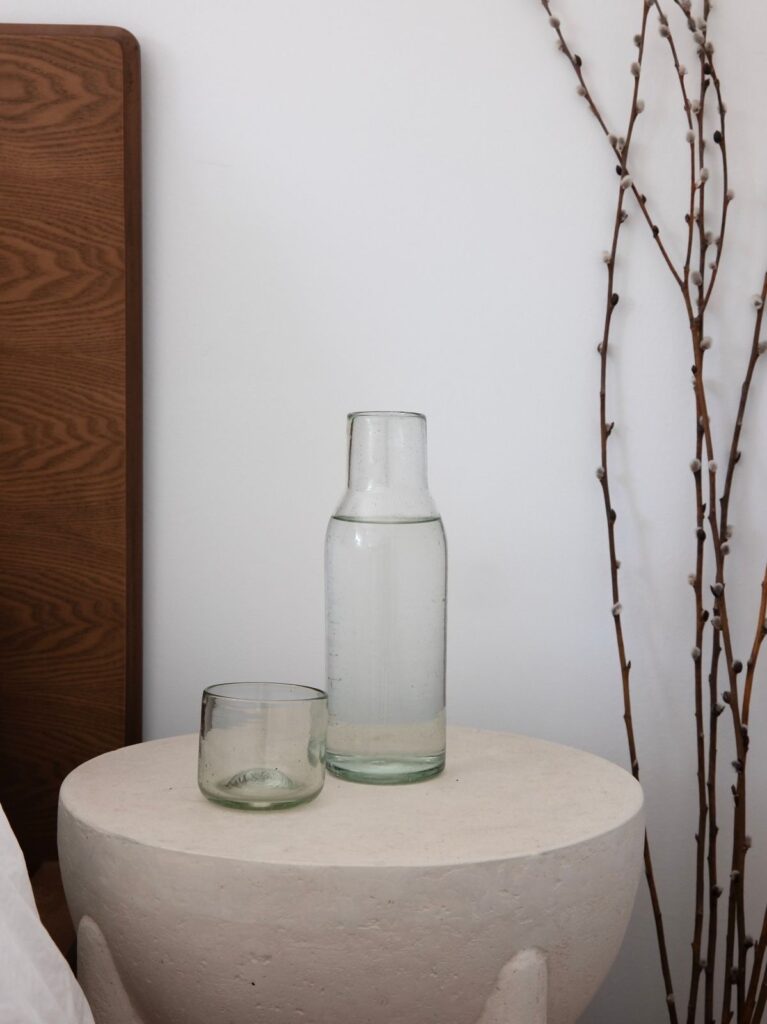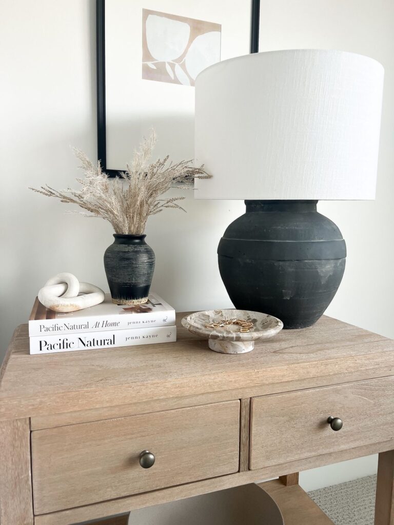 A soft lamp, a small dish for jewelry, maybe a pretty book… keep it simple and calming.