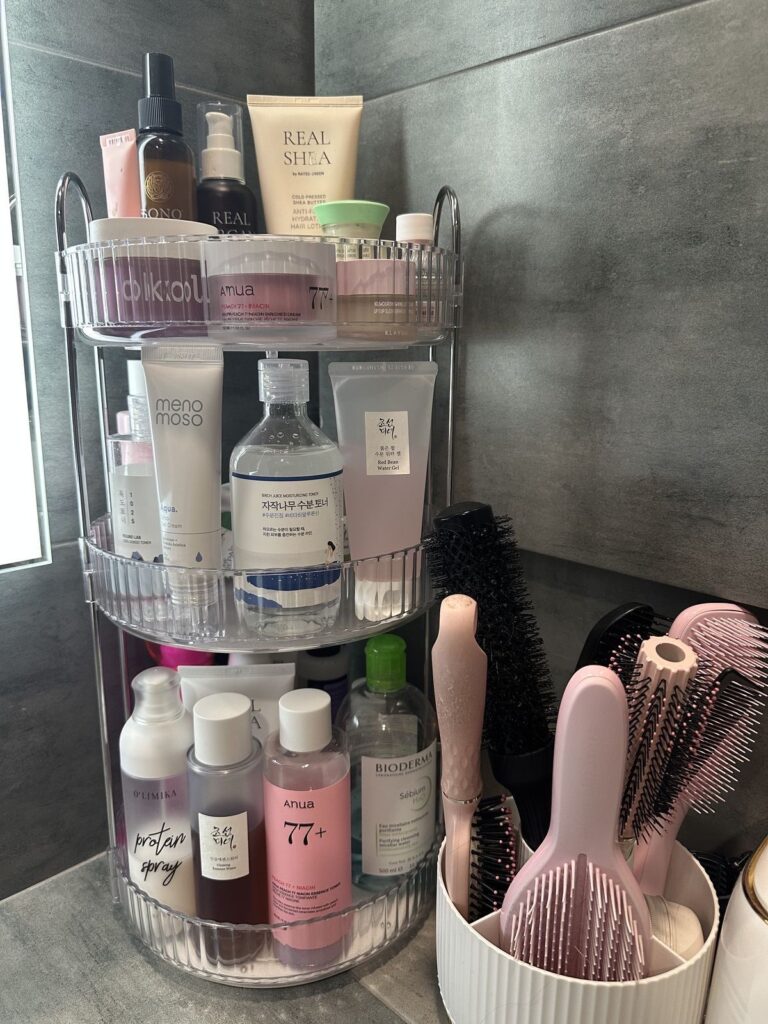 Do you use the same products every single day? Keep those out and accessible. A tiered organizer keeps things visible without taking over your counter.