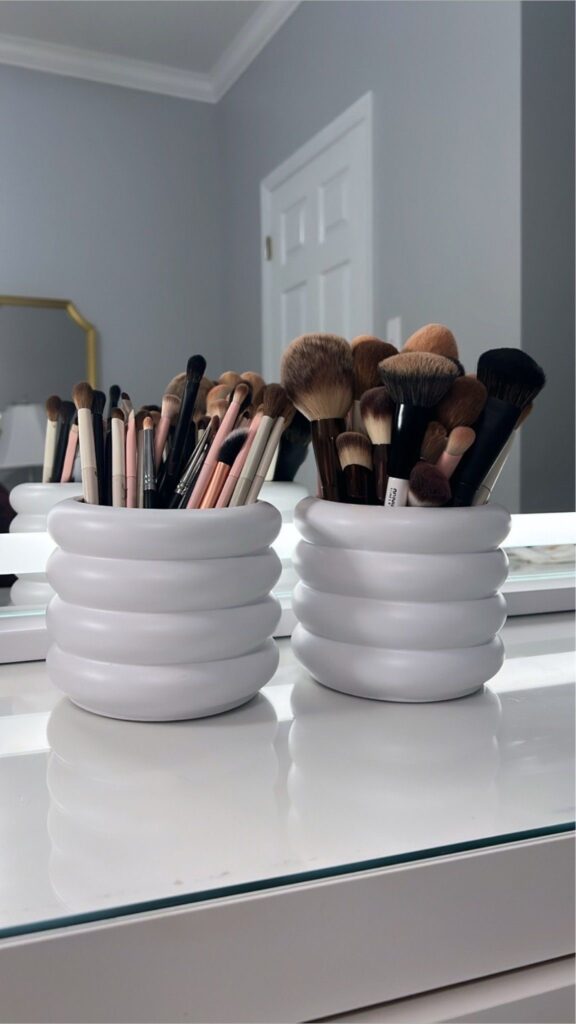 When your makeup setup looks good, you’re more likely to maintain it. Neutral containers, matching bins, and a little intention go a long way.