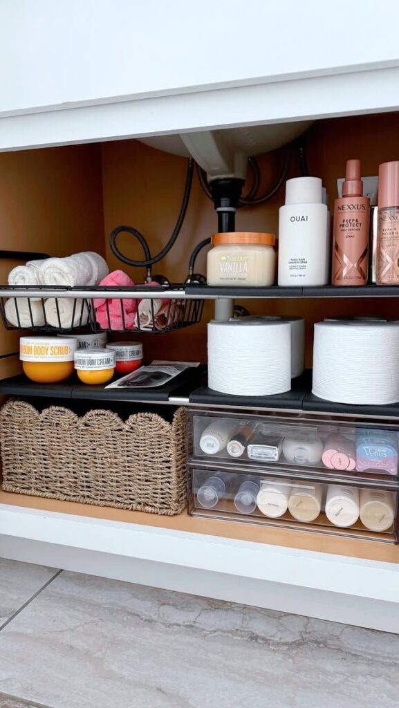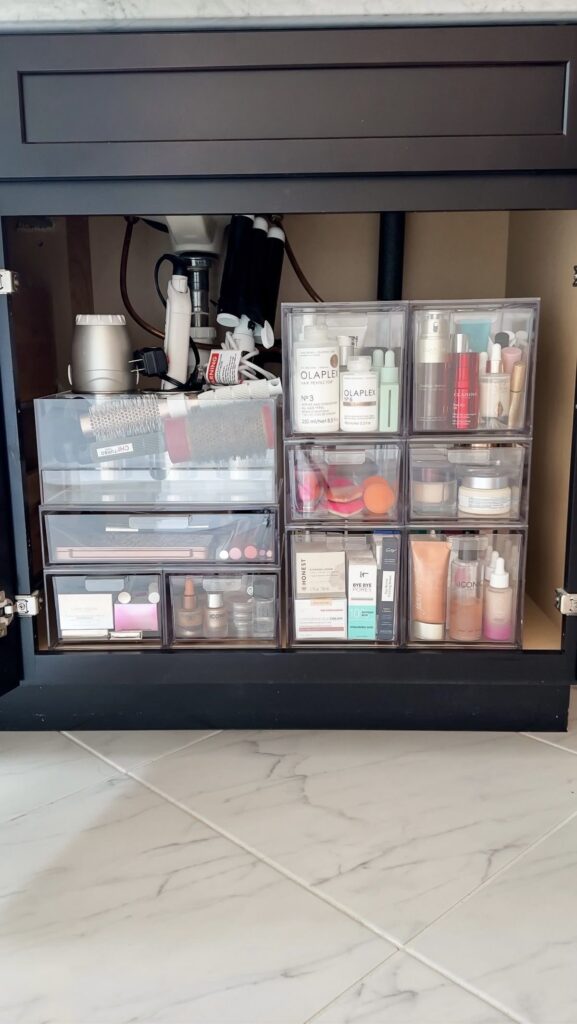 That space under your sink? It has so much potential. Stackable bins work great for extra makeup, backups, or products you don’t use daily.