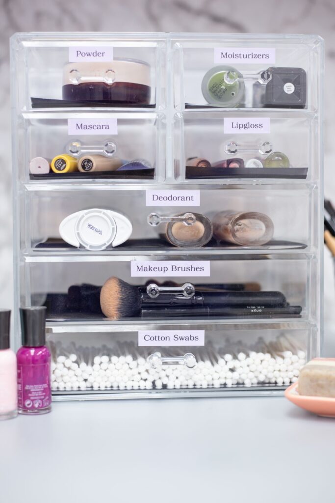 Extra mascaras and foundations don’t need to crowd your everyday space. Store backups in a separate bin so your main setup stays clean.