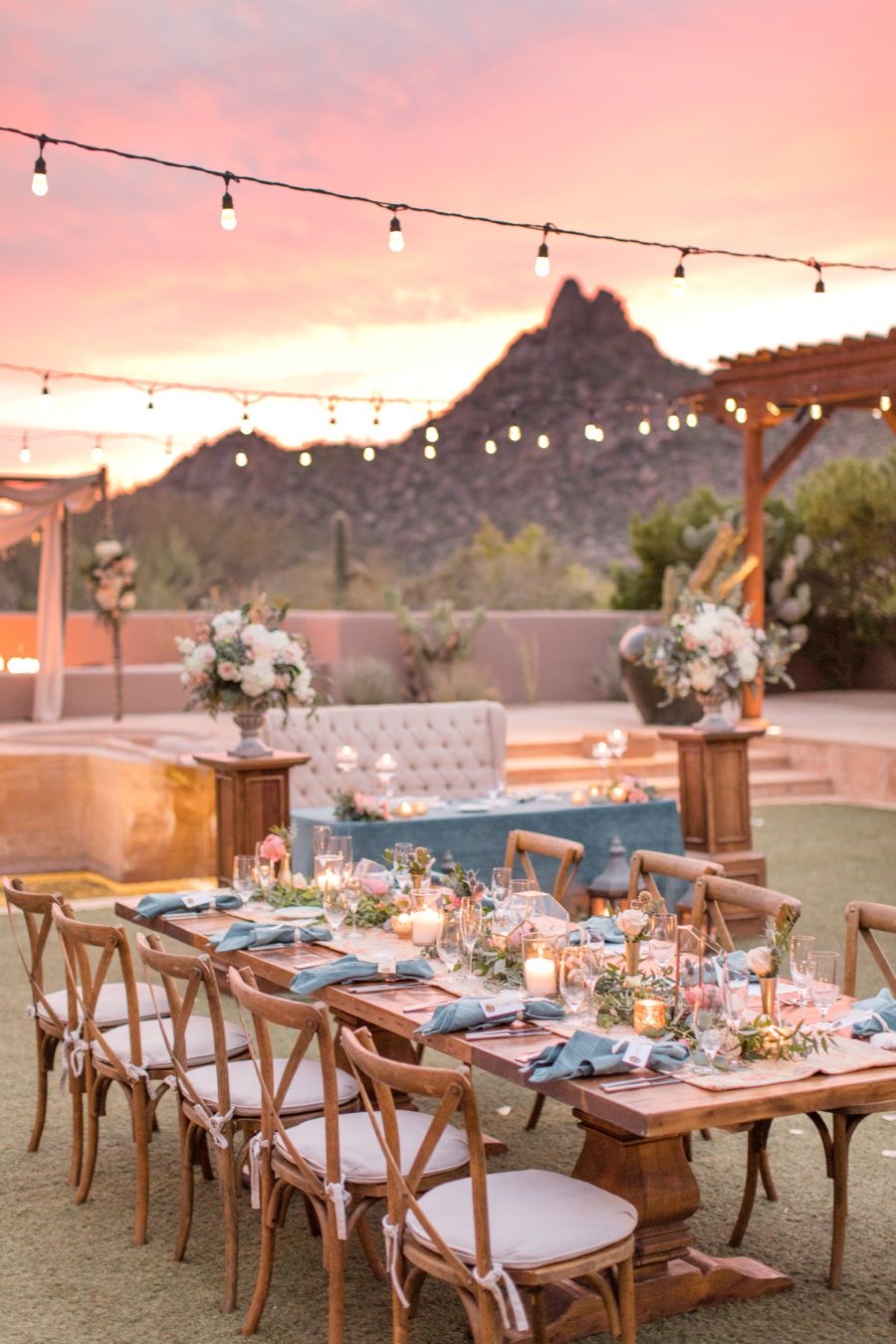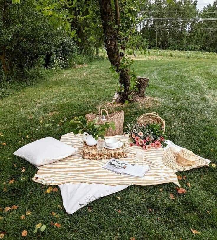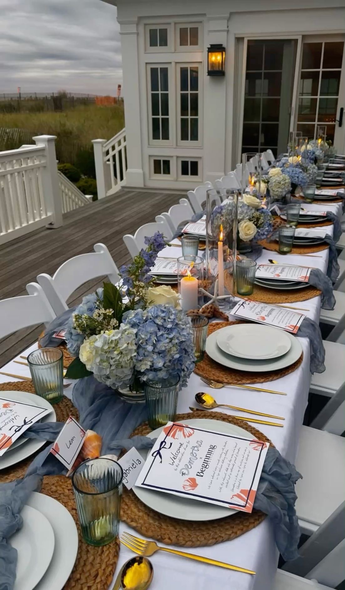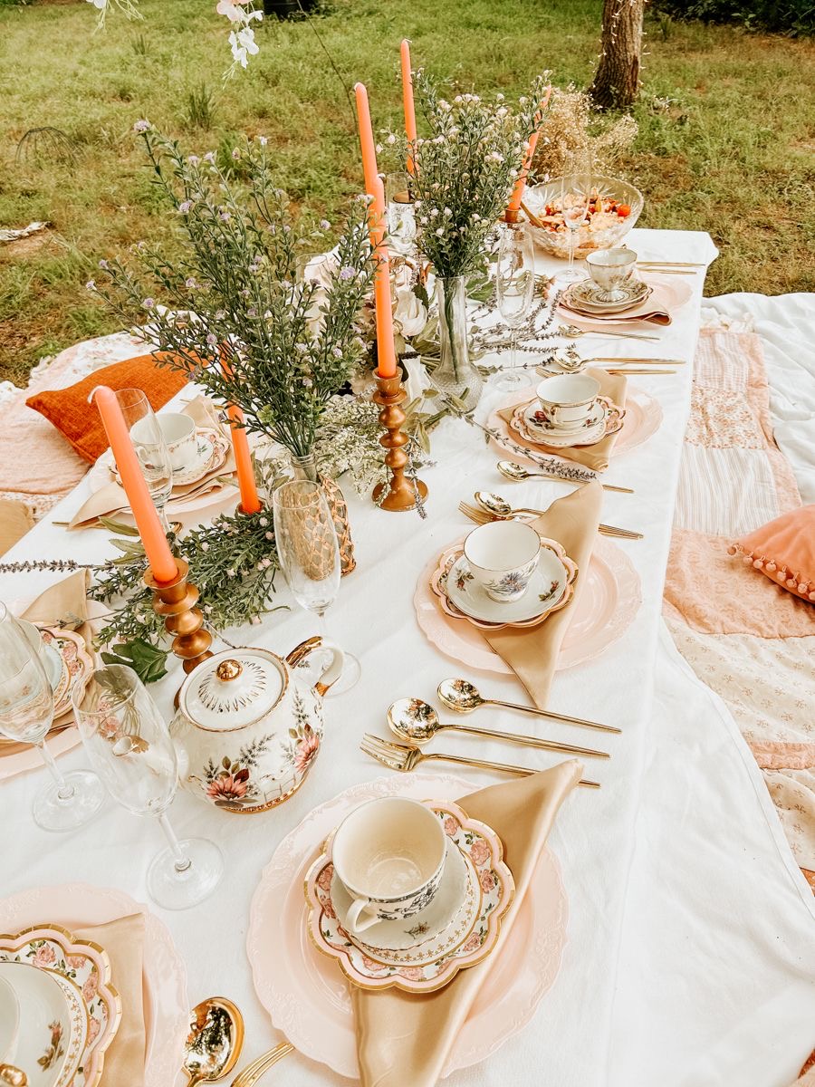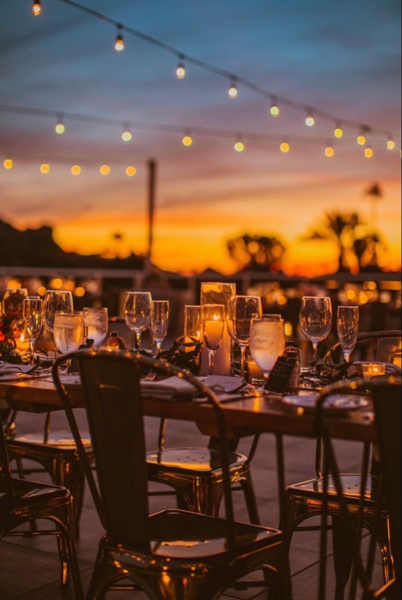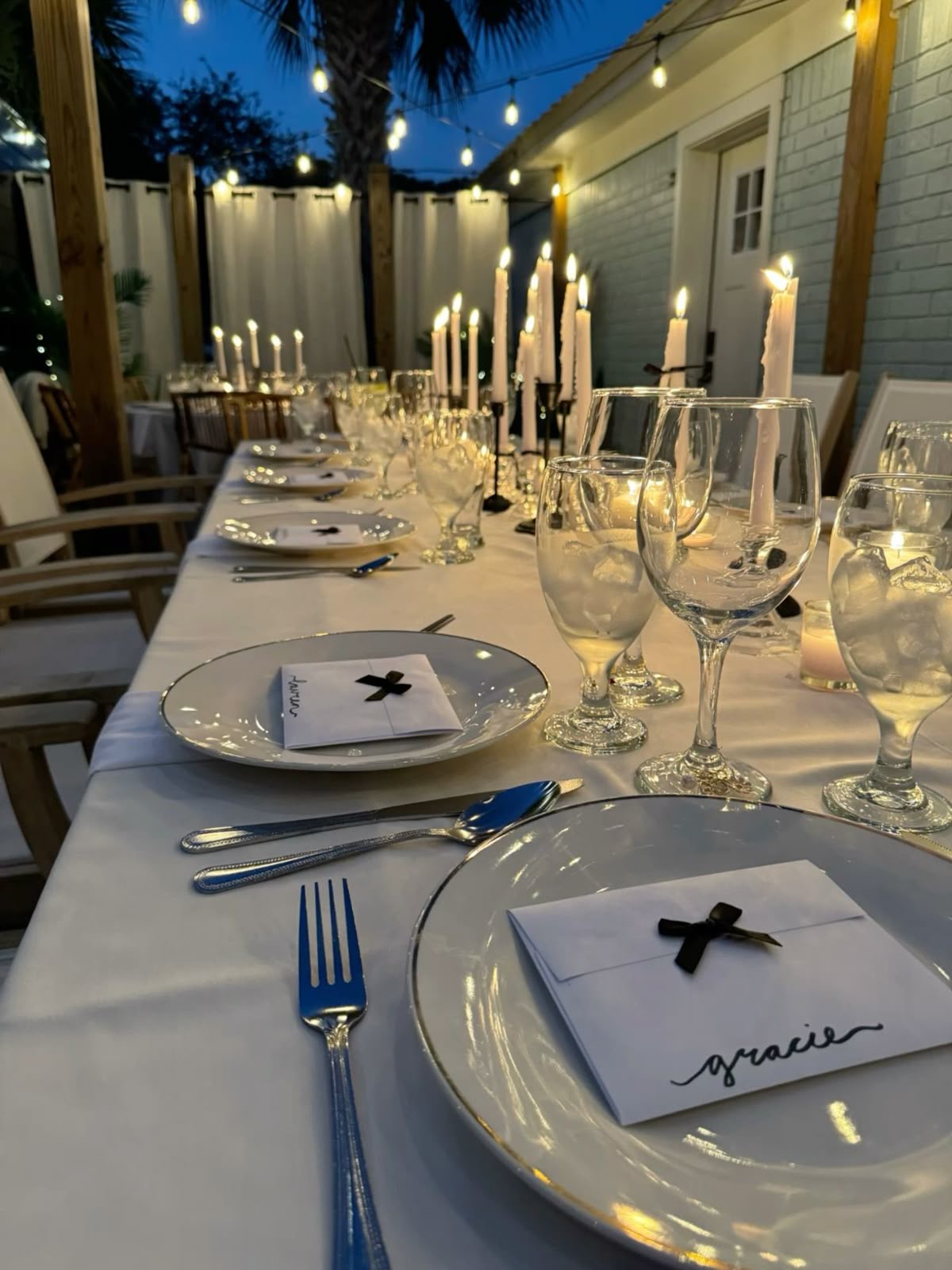 Plan dinner to start during sunset so the lighting is chef’s kiss. Use warm-toned candles and serve light, summery food like salad, chicken, or fruit.