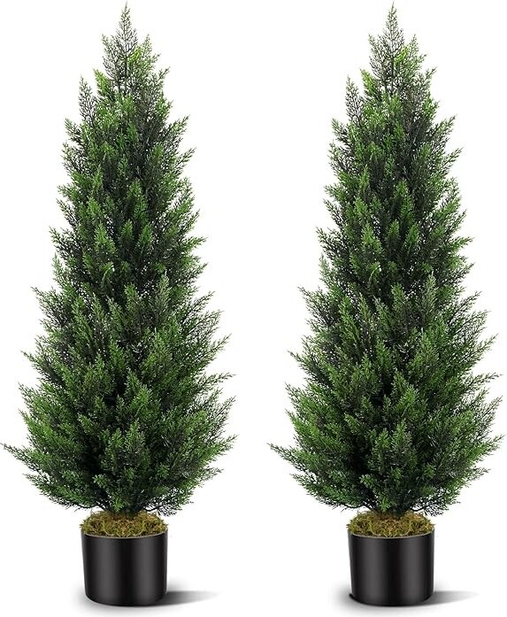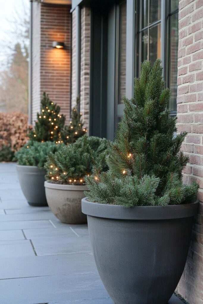 Place your small evergreen trees in pots around your porch. Decorate with mini lights or ribbon for a simple, elegant look.