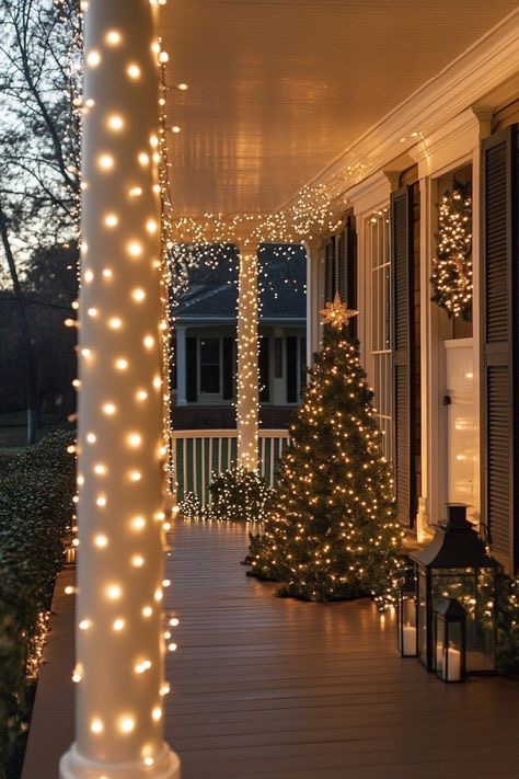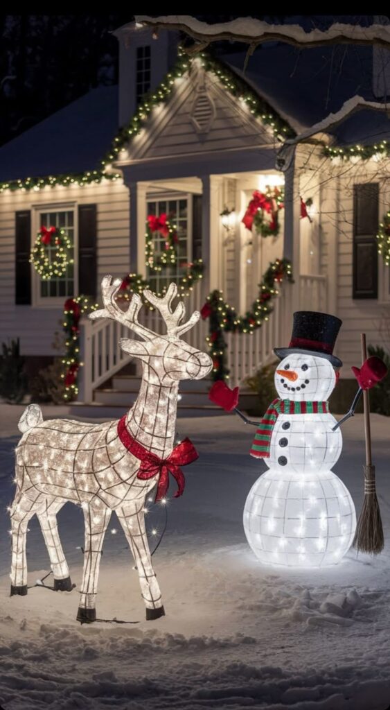 You really can’t go wrong with string lights. Wrap them around your trees, bushes, or along your porch railing. Warm white lights give a cozy vibe, while multicolor ones screams classic holiday fun.