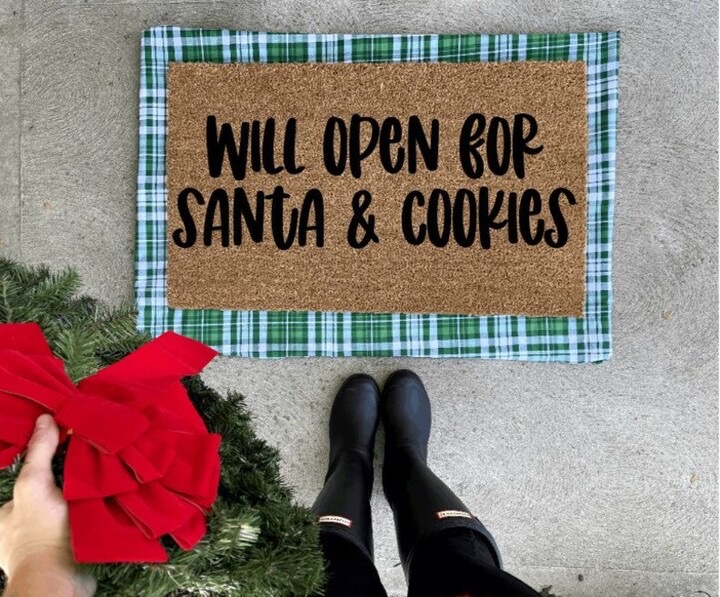 A cheerful doormat with a holiday message instantly greets guest with festive vibes.