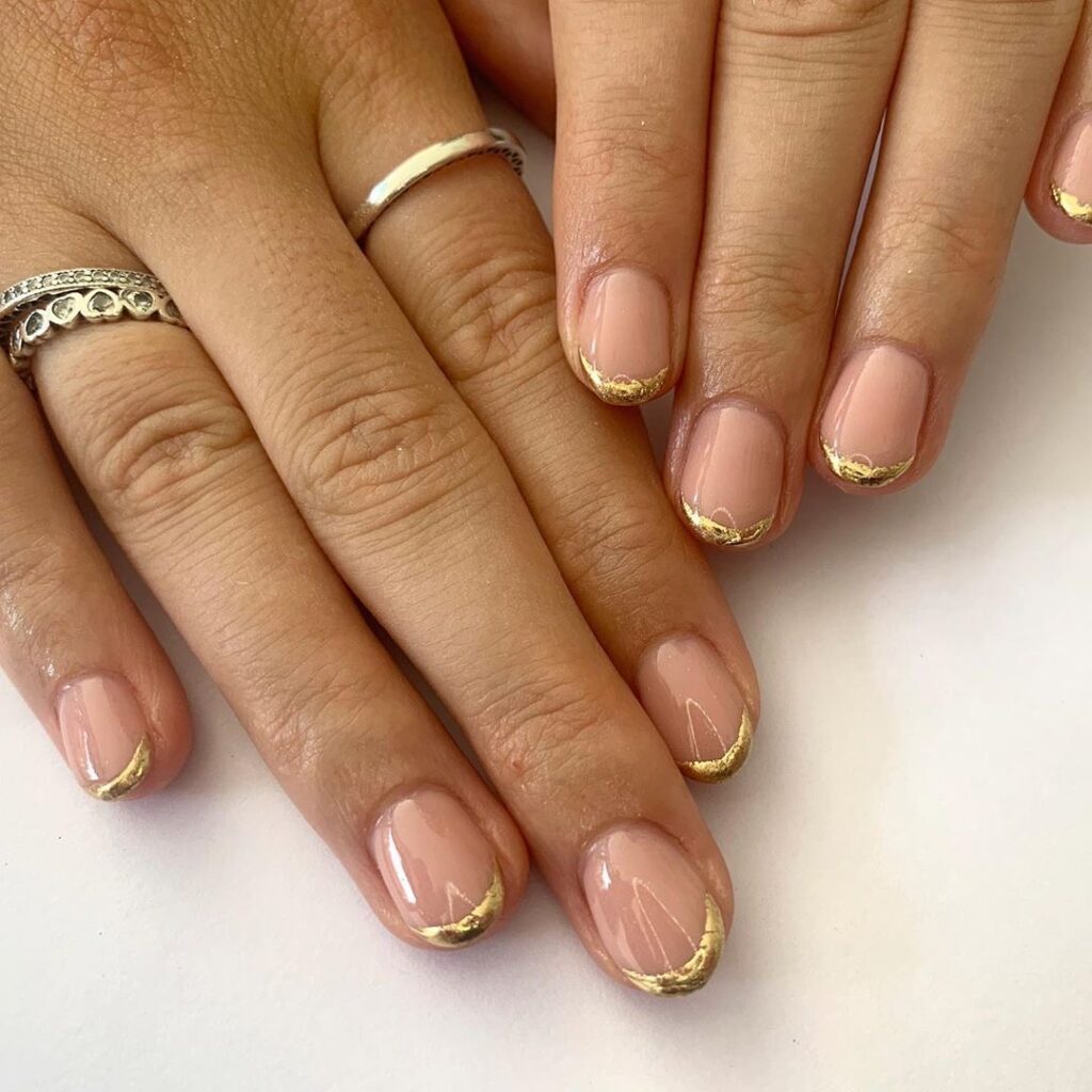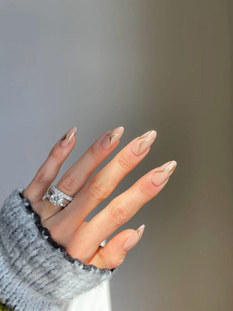 A Simple nude base with thin gold lines. Effortless, clean, and matches literally everything you wear on NYE.