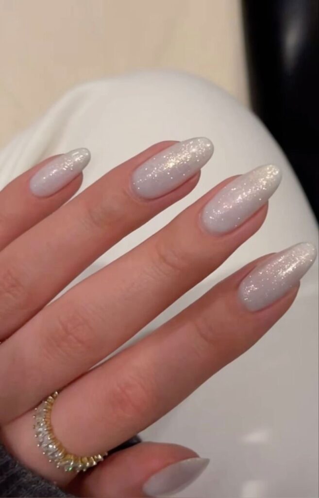 A soft milky base sprinkled with shimmer. It’s like snowy January nails without being too winter-themed.