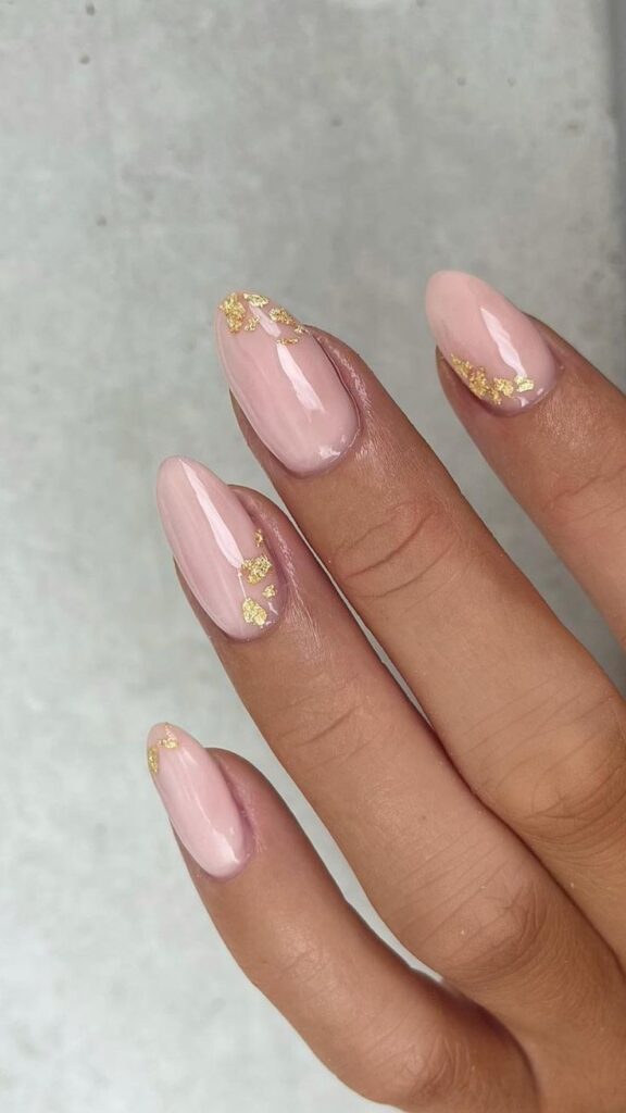 A clean base topped with tiny pieces of gold foil. Simple but makes your nails look expensive.