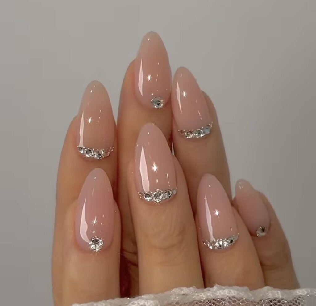Delicate rhinestones around the cuticle line. Soft, minimal sparkle without being too much.