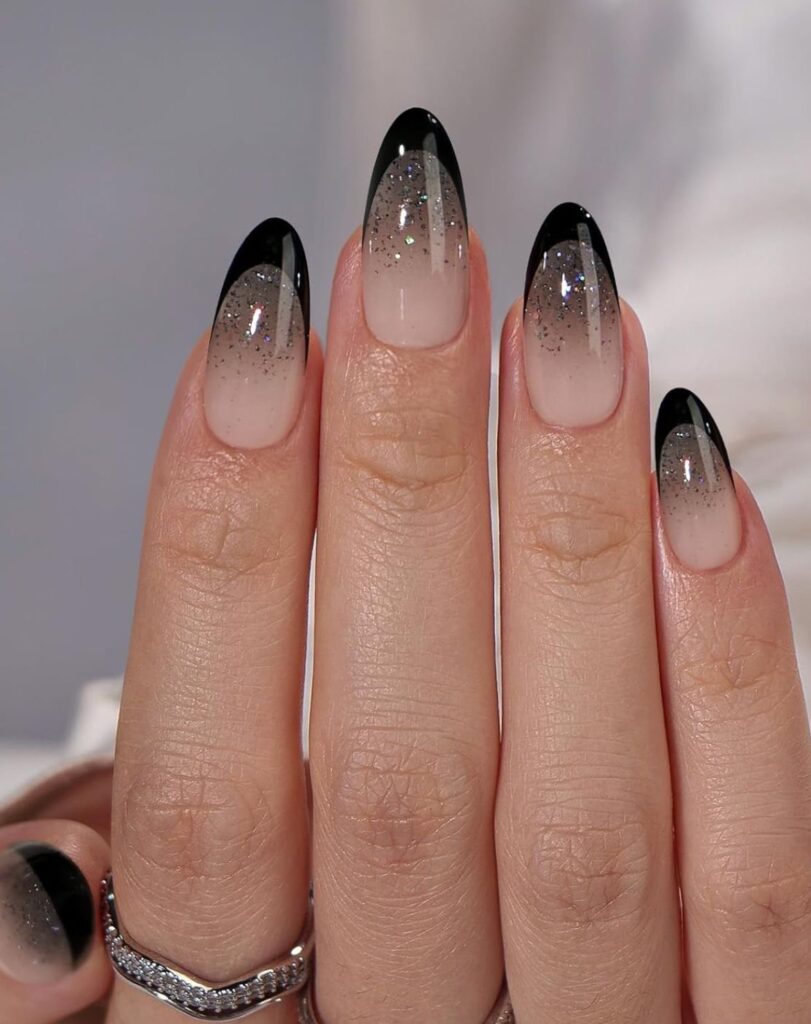 A sheer black base where glitter gets heavier toward the tips. It’s glam without being chunky.
