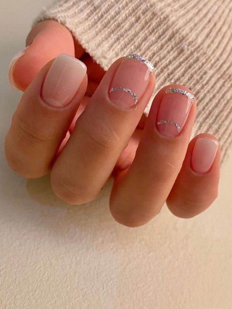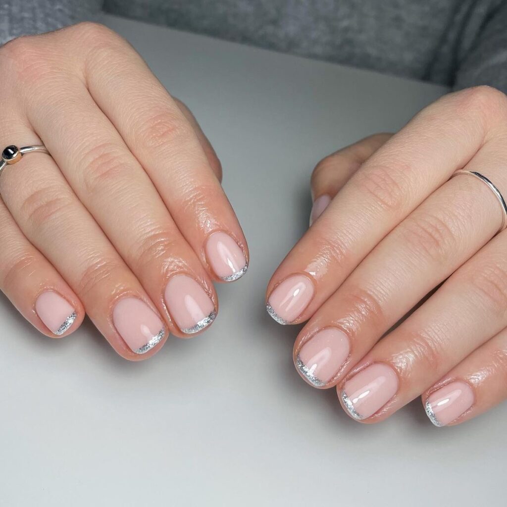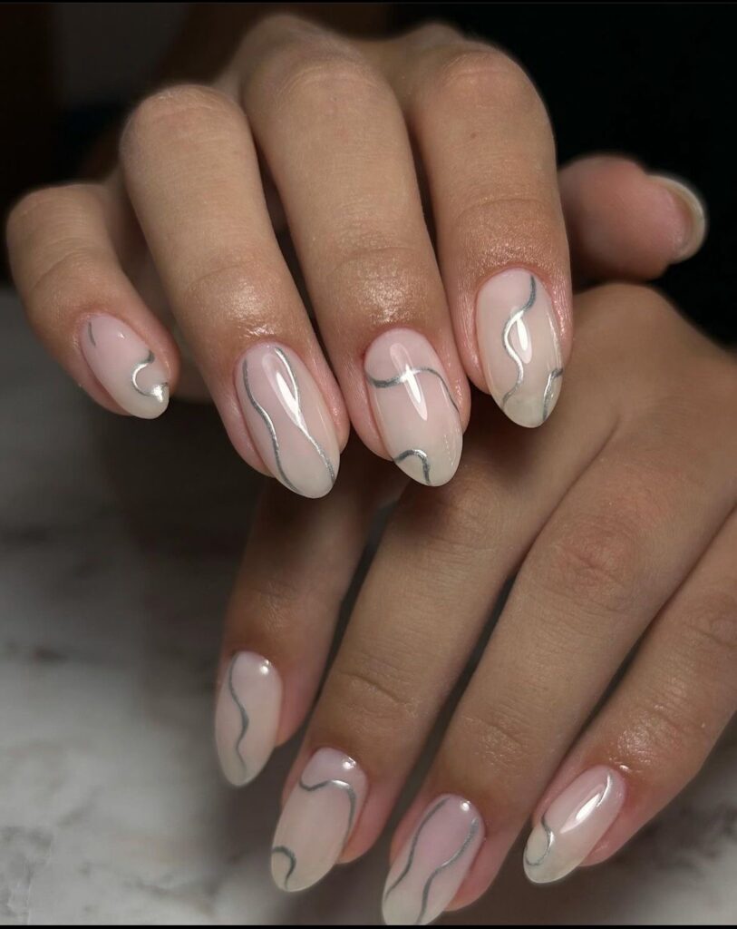 A clean nude nail with thin silver half-moon at the base. Chic and super easy to maintain.