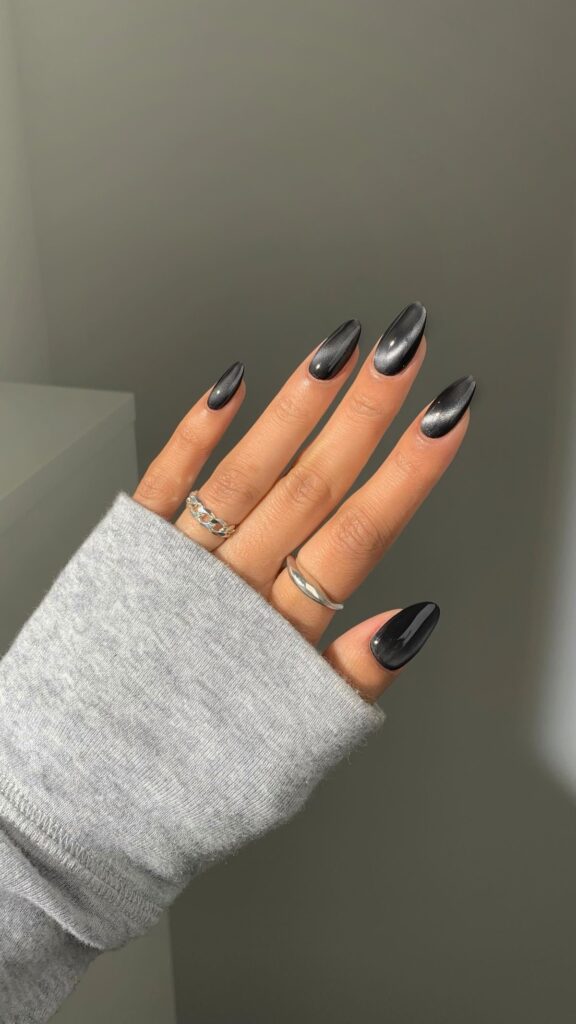 Black nails with subtle chrome patches. Edgy but still minimal.
