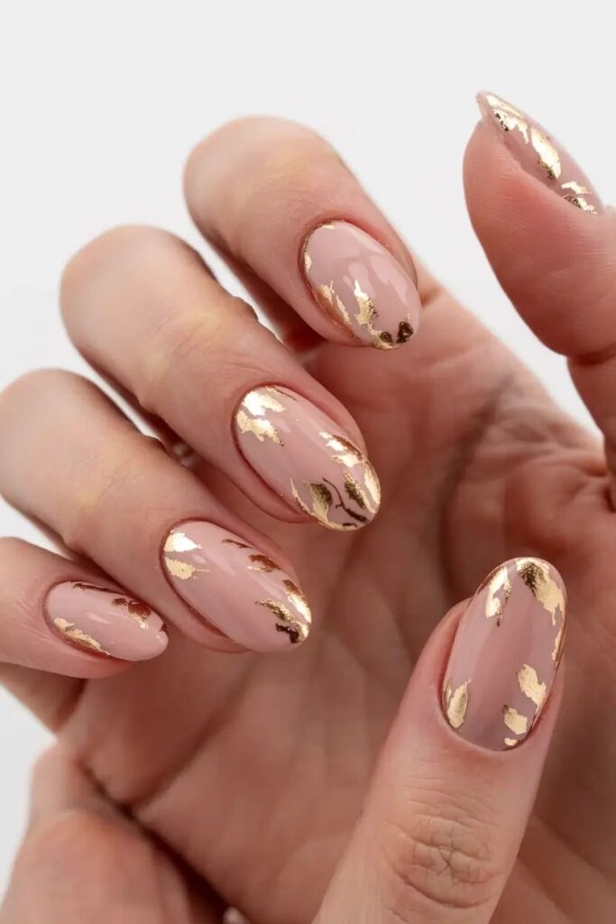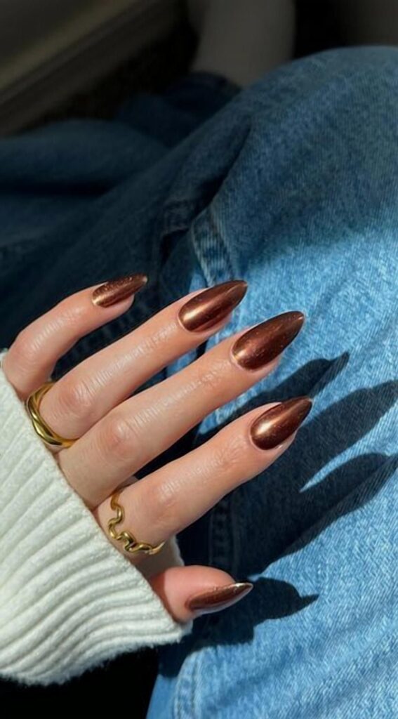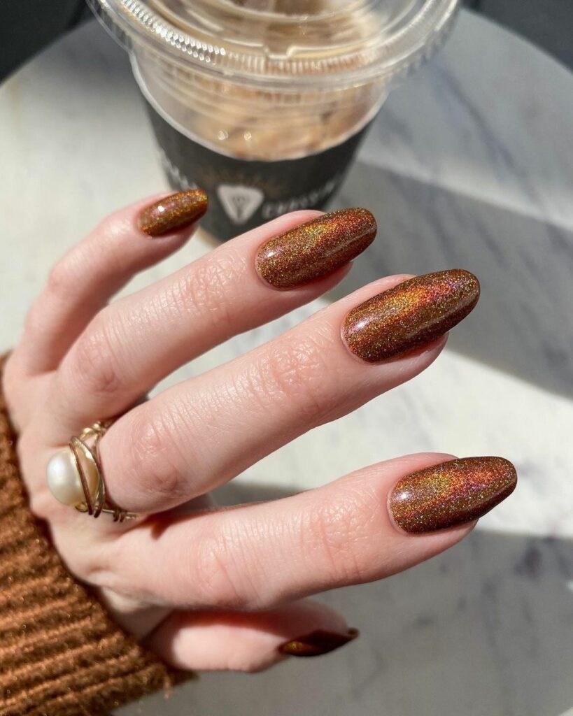 If you’re craving sparkle but want to keep it subtle, bronze shimmer nails are your answer.
