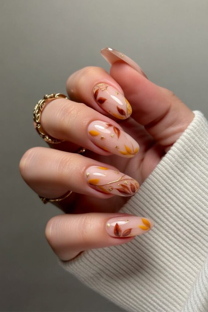 Tiny leaf accents on nude nails? Totally adorable and so fall.