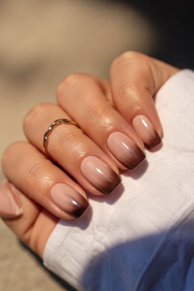 Warm brown ombré nails that give coffee shop energy.