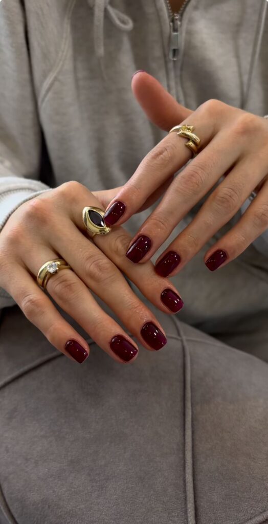 For the cooler months or honestly anytime you want something rich and dramatic, a deep burgundy on a short square nail is sophisticated in a way that a longer nail actually can’t quite replicate. The shape makes the color the entire focus.