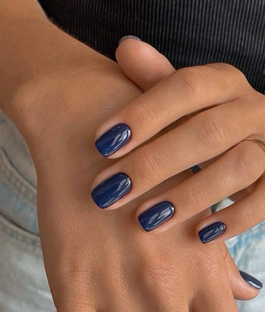 A deep navy on short square nails reads polished and classic rather than trendy. It’s the kind of color that works for a work meeting on a Monday and a dinner out on a Saturday without changing anything else about your look.