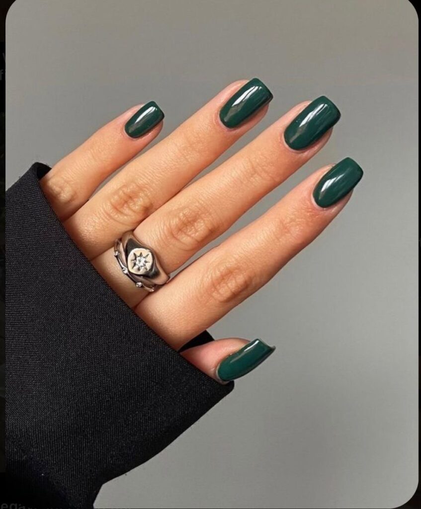 A dark green on short square nails is of those color choices that looks unexpected and completely right at the same time. It works especially well in fall and winter but doesn’t look out of place in any season.