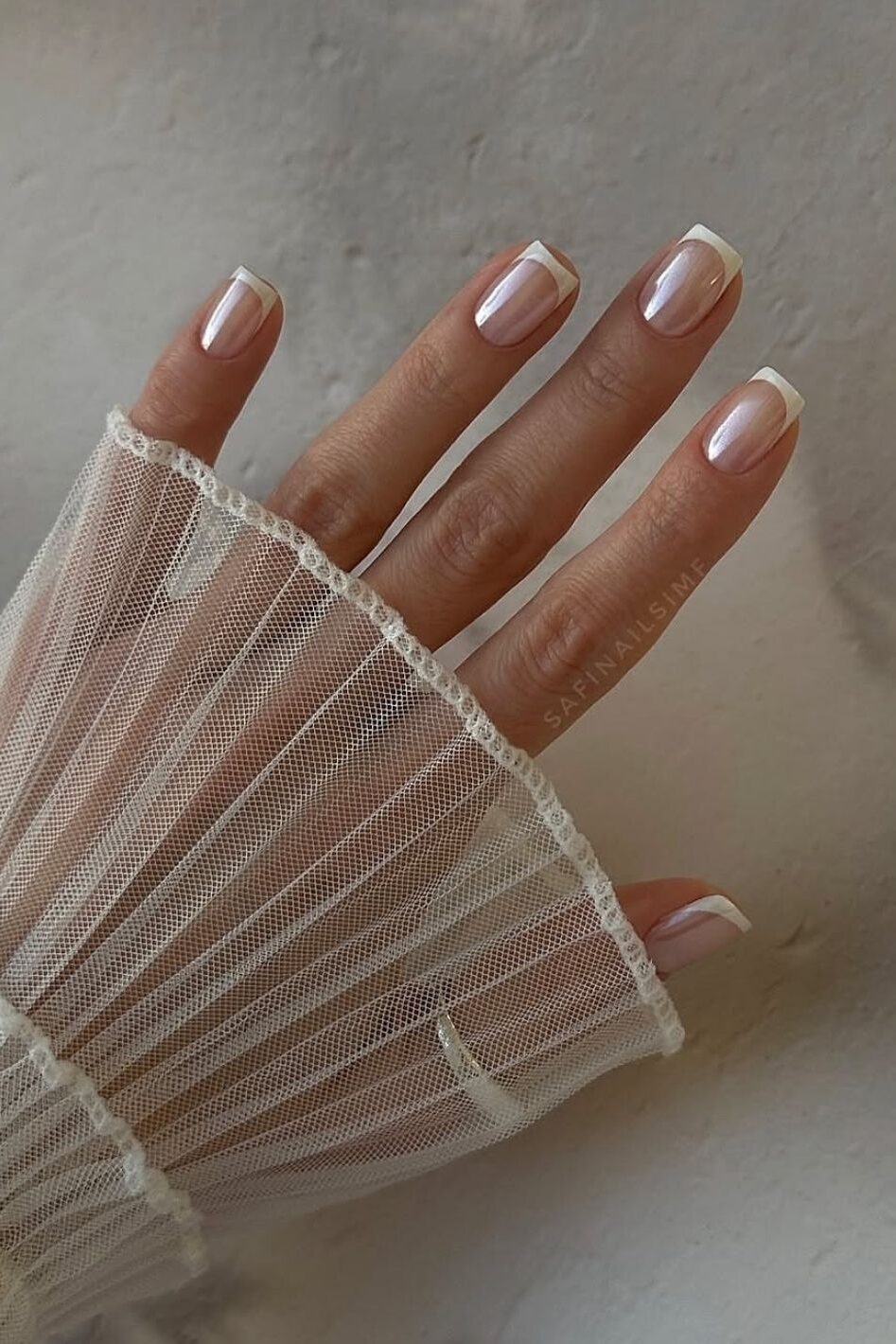 The classic white tip on a nude base is timeless but the versions getting attention right now are more interesting. A colored tip, a thicker graphic line, a reverse French — the short square shape is perfect for any version of the French nail because the edge is so defined.