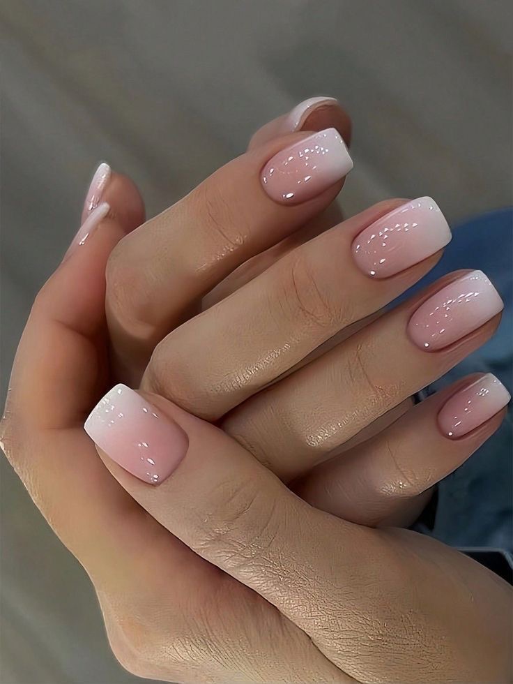 A soft fade from one color to another on a short square nail looks polished and done even when it isn’t. A nail sponge and a little patience is all you need at home.