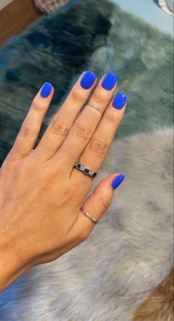 A bright cobalt blue on short square nails is a statement that doesn’t require anything else. No nail art, no accent, no special finish — just that color, that shape, and the confidence to wear it.