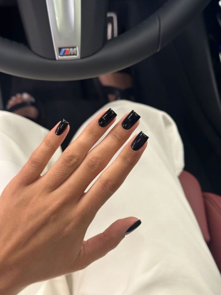 For when you want something sharp, graphic, and a little bit of an attitude. A glossy black on short square nails is one of those looks that is impossible to pull off badly. The shape keeps it clean, the color does the rest.