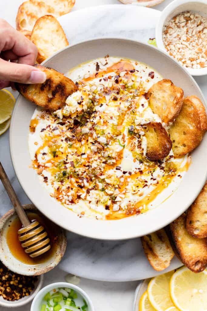 Blended feta, cream cheese, lemon, and olive oil whipped until smooth and silky, topped with a drizzle of hot honey and fresh herbs. Serve with warm pita and vegetables and watch it disappear faster than anything else on the table.