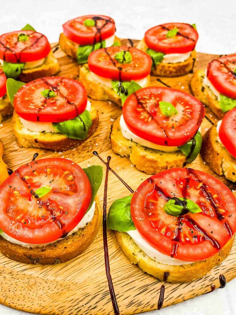Small toasted baguette rounds topped with fresh mozzarella, tomatoes, and a basil leaf. Drizzle with olive oil right before serving. Simple, beautiful, and always goes fast.