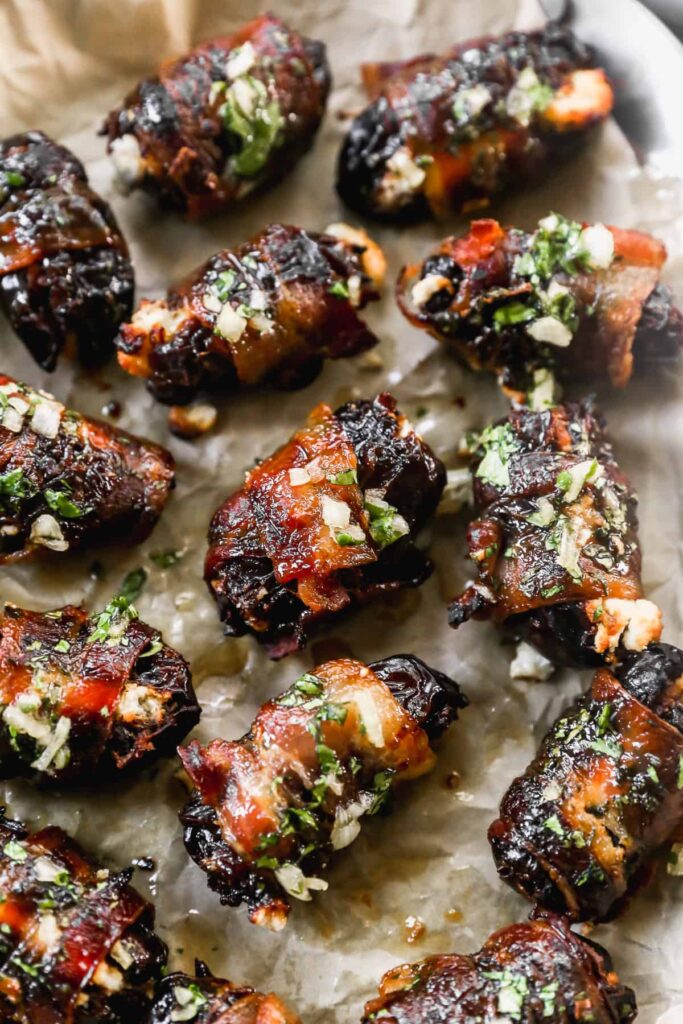 Dates stuffed with a little goat cheese or almond, wrapped in bacon, and roasted until caramelized. They are sweet and salty and slightly addictive and they sound more complicated than they are.