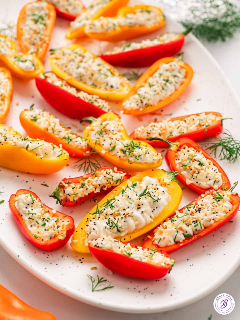 Mini sweet peppers filled with herbed cream cheese or a whipped feta mixture. No cooking required, beautiful color on a platter, and easy to eat in two bites standing up.