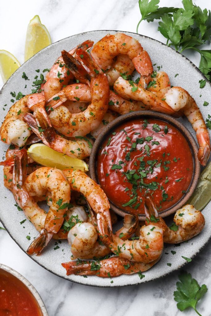 Cold, perfectly cooked shrimp hanging over the edge of a bowl of good cocktail sauce. It looks elegant without any real effort and there is something about cold shrimp at an outdoor party that people genuinely love.