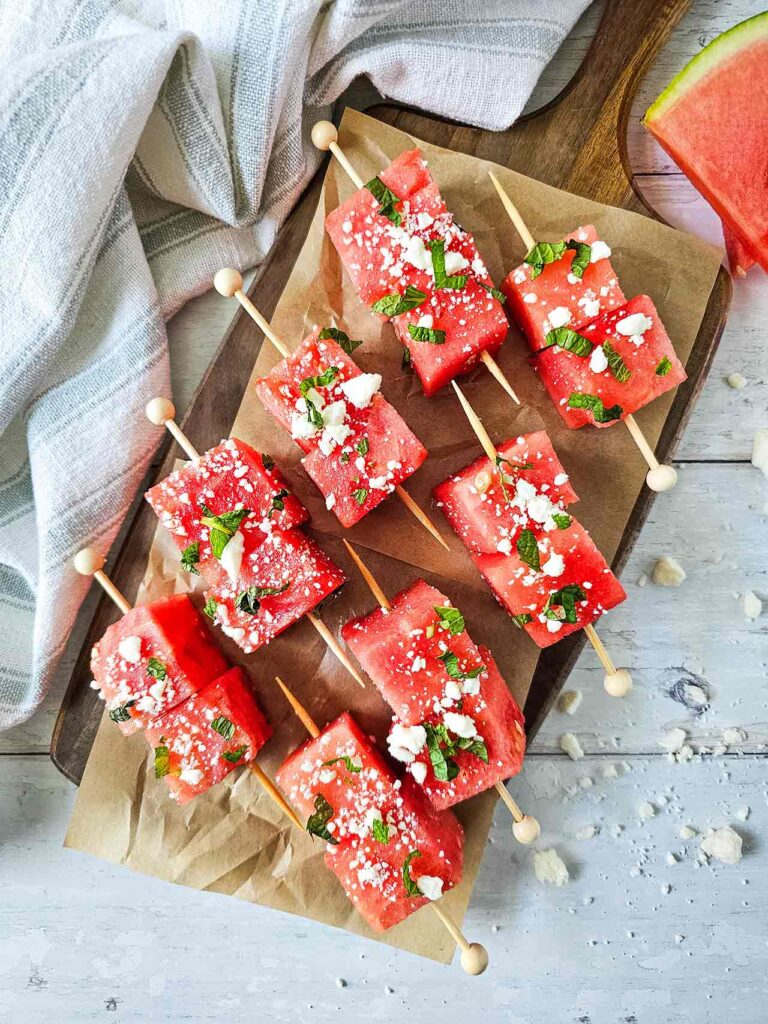 Cubes of cold watermelon and feta on a short skewer with a fresh mint leaf. Cool, refreshing, sweet and salty — the most summery finger food there is and one of the easiest to put together.