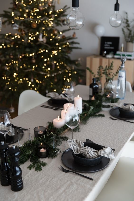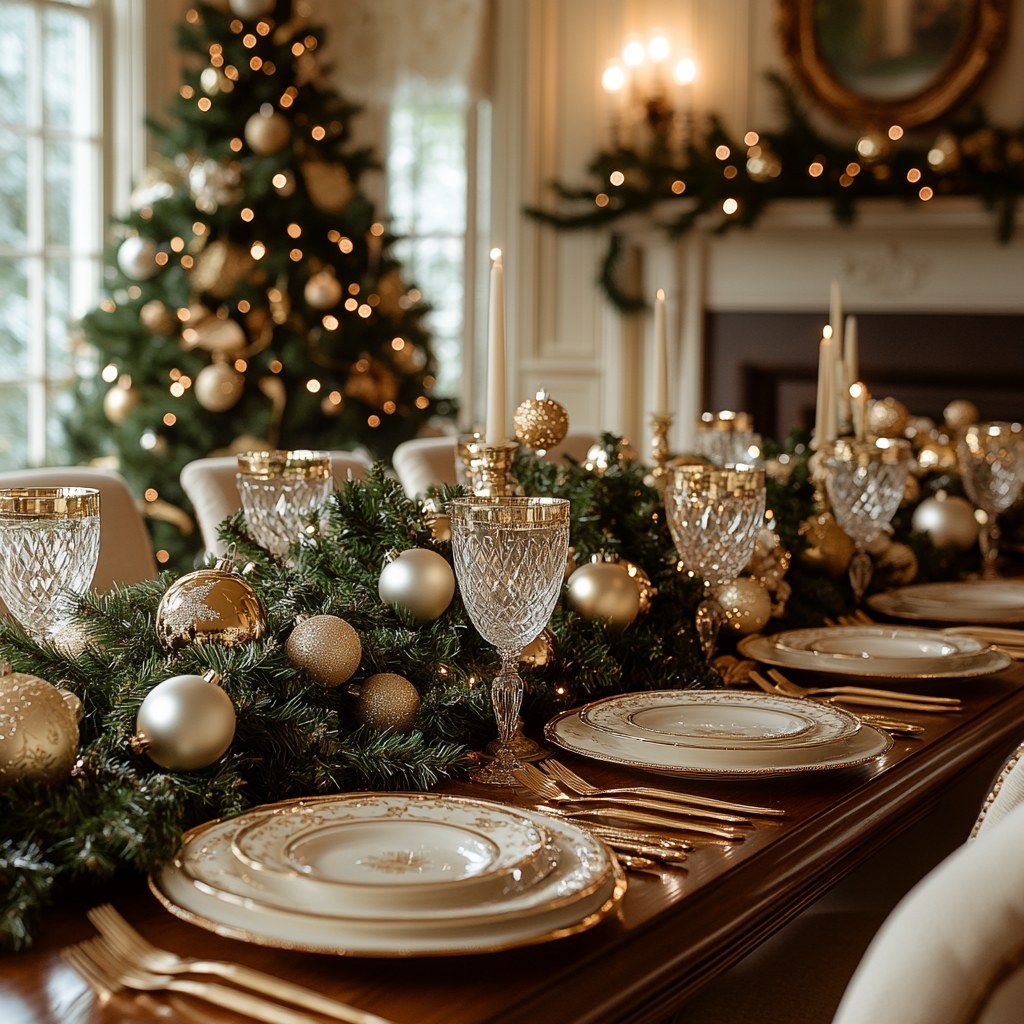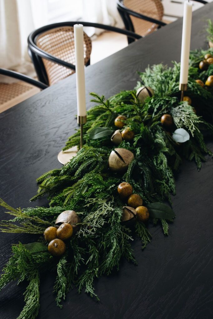 Grab a long garland (real or faux), lay it down the center, and tuck in a few gold ornaments or candles. It’s the easiest way to make your table look full and lush.