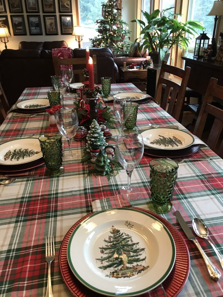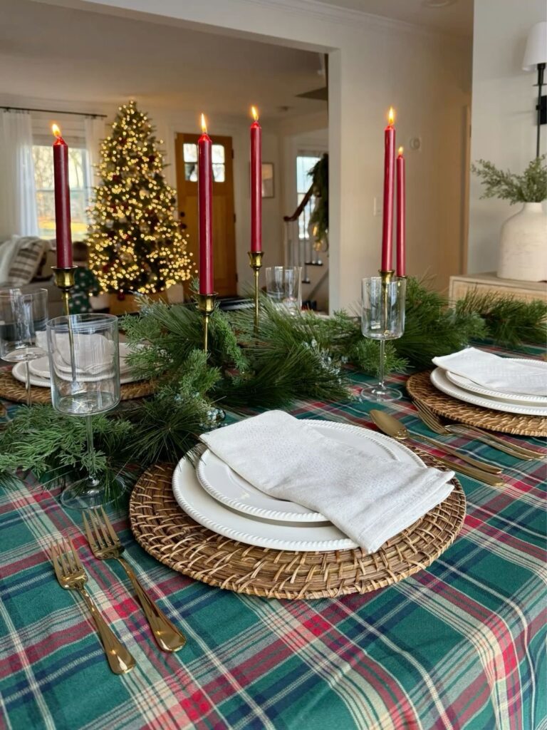 A plaid tablecloth or runner adds so much warmth. Pair it with brass candlesticks and greenery and you’ve got a cozy, classic look.