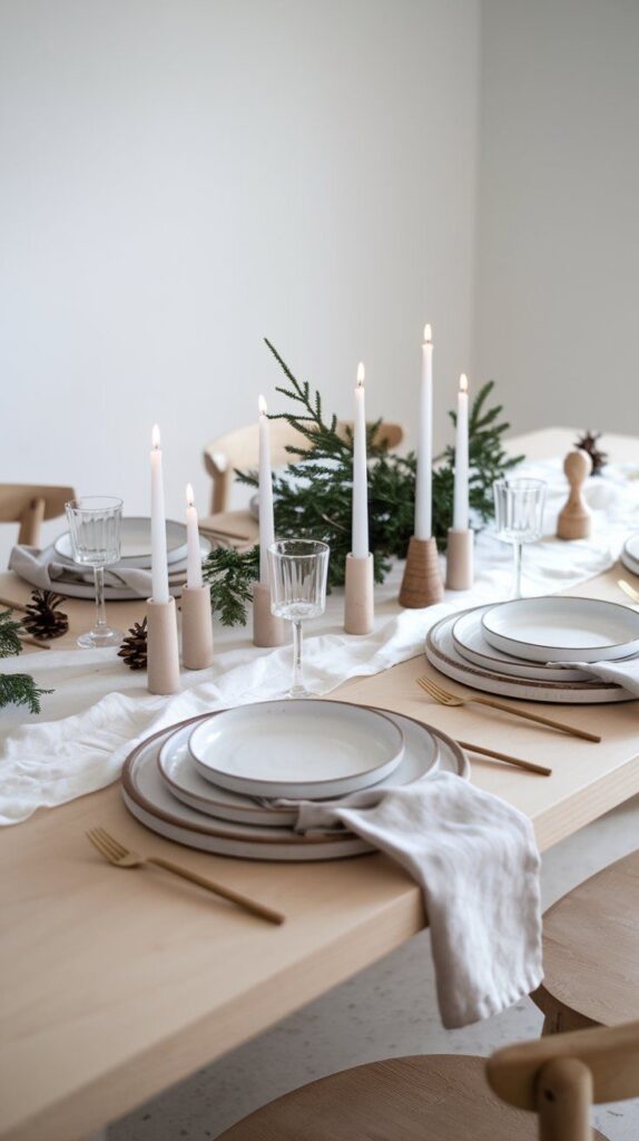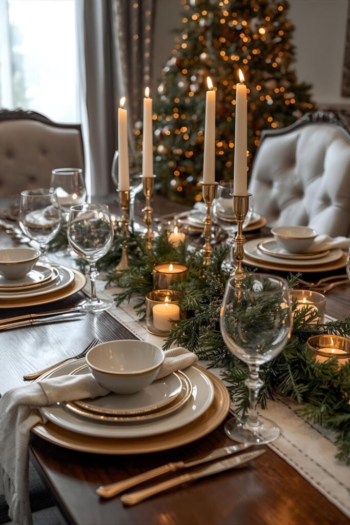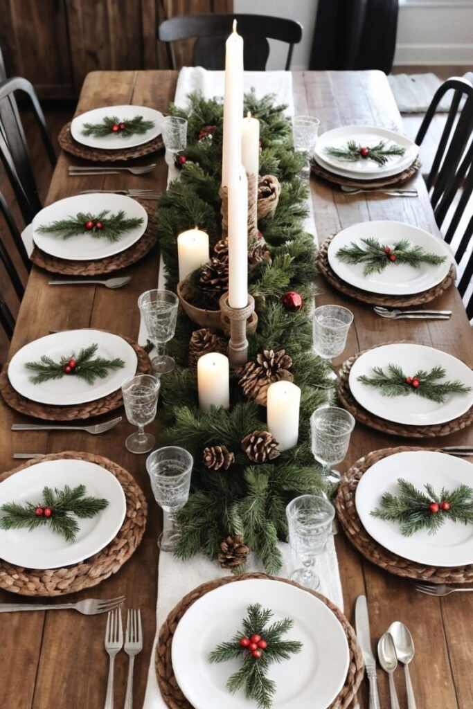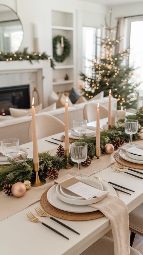 Use a neutral runner, add wooden candle holders, woven chargers, and simple greenery. It’s cozy, warm, and feels straight out of a farmhouse Christmas movie.